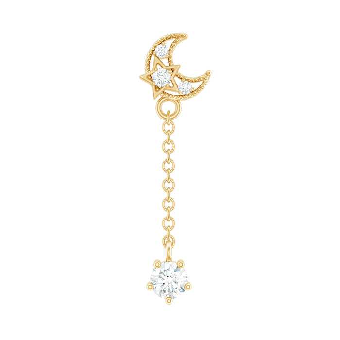 Our Gold Moissanite Chain Drop Earring featuring a Moon and Star Design with Round Cut Moissanites is sure to turn heads wherever you go! The exquisite piece of jewelry also features a drop of Round Cut Moissanite on a chain, making it even more appealing. The Helix Chain Earring is crafted in Gold, adding to its luxurious look. Gift this stunning Earring to your loved one on any special occasion to make it a memorable one!
