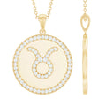 Take on the world wearing this Zodiac Disc Pendant embellished with Round Cut Moissanite in Pave Setting arranged in the pattern of Taurus Zodiac symbol. This Moissanite Zodiac Pendant has been intricately crafted in hallmarked metal, making for a flattering accessory for all the May borns out there.