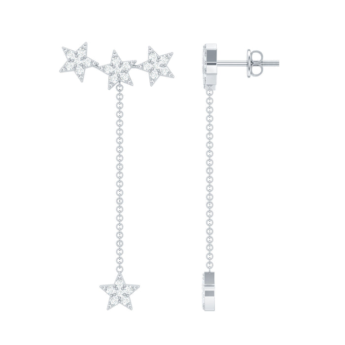 A little shimmer from the night sky feels even closer when a pair of Diamond Star Earrings rests gently on your ears. At the top sits a trio of tiny stars, each one covered in shimmering round diamonds set closely in pave setting for a bright and glowing finish. Hanging below is a dangling star, also wrapped in shining stones and connected through a delicate chain that moves gently with you. The screw back closure keeps the Diamond Dangle Earrings secure and comfortable, making them easy to wear all day without worry. Their lightweight feel adds to the charm, letting the design flow naturally without pulling or discomfort. Each stone is crafted in high HI-SI quality, giving the Star Chain Earrings a sparkling finish that stands out beautifully in both daylight and evening light. Perfect as a meaningful gift or a special treat for yourself, these Celestial Earrings offer a lovely blend of shine, movement, and star-inspired beauty, ideal for anyone who loves unique, magical designs.