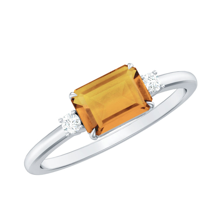 The Natural Emerald Cut Citrine East West Engagement Ring with Diamond offers a refined yet distinctive alternative to traditional engagement styles. Featuring a horizontally set emerald cut citrine, this design highlights clean lines and balanced geometry while introducing a warm golden tone at the center.