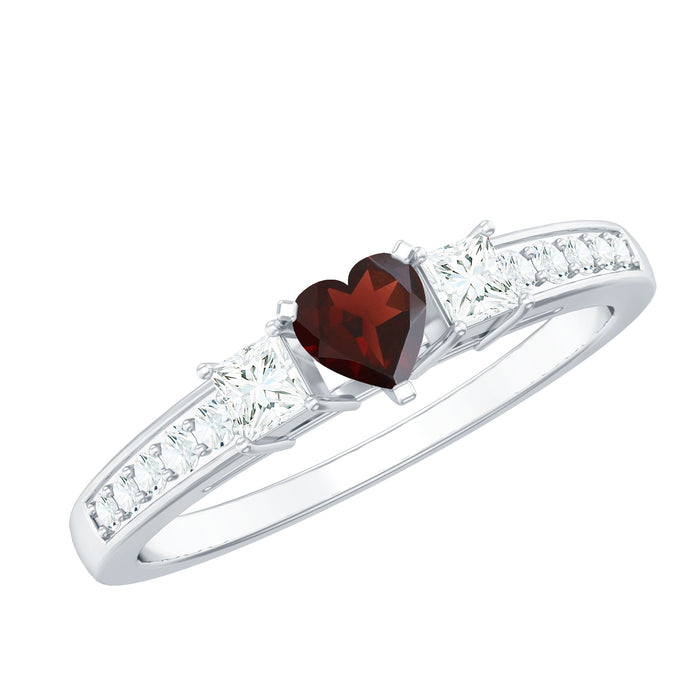 A heartfelt piece of jewelry, this Heart Promise Ring is a beautiful expression of love and devotion. The centerpiece is a stunning 4 mm Heart Shape Garnet set in Prong Setting, its deep red color evoking the warmth and passion of a truly unforgettable connection. On either side, a sparkling Princess Diamond adds a touch of elegance and timeless beauty, while the band is adorned with delicate round Diamond stones, creating a harmonious balance of light and sophistication. Every detail of this Garnet Diamond Ring is designed to capture the essence of a love that is pure, enduring, and full of promise. Whether you are marking a special milestone or committing to forever, this Garnet Heart Ring is the perfect symbol of your feelings. Its unique heart shape represents the depth of emotion, while the Diamond stones reflect the strength and brilliance of your bond. Presented in a signature jewelry box, this Red Garnet Ring comes in various sizes to ensure the perfect fit for your loved one.