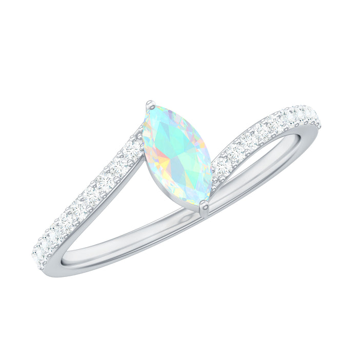 This natural marquise Ethiopian opal diamond promise ring is designed for those who appreciate individuality in meaningful jewelry. The elongated marquise silhouette creates a refined, graceful look on the finger, while the opal’s natural play of color offers a unique and personal character suited to promise occasions.