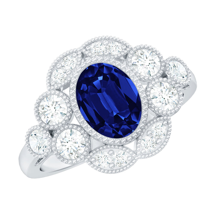 Make a grand and unforgettable statement of your love with this breathtaking Statement Engagement Ring. Featuring a dazzling Oval Cut Created Blue Sapphire at the center, surrounded by a halo of shimmering Round Diamond stones, this ring is an enchanting piece of fine jewelry that will leave your lady overwhelmed. The Gold Beaded Details of the ring add a touch of elegance and sophistication, making it even more exquisite and beautiful. Give this extraordinary Oval Created Blue Sapphire Ring to your special someone and let her know just how much she means to you.