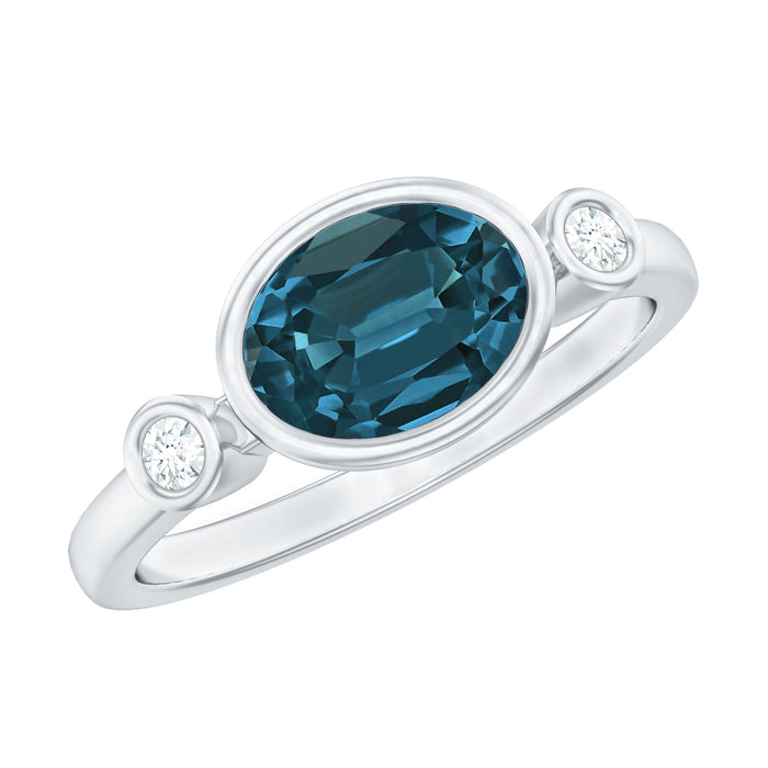 This exquisite London Blue Topaz Ring embodies both significance and elegance in a single flawless piece. It showcases a 6X8 MM oval cut London blue topaz, securely held in a smooth bezel setting with two round shape diamond accents. The striking color of the blue topaz commands attention, while the engraved details provide a charming accent. Whether you are embarking on a new journey or simply wish to express your affection for someone special, this Blue Topaz Solitaire Ring serves as a beautiful gesture. It is both simple and timeless, embodying the essence of a promise ring. The bezel setting not only safeguards the gemstone but also imparts a sleek and contemporary flair to the design. Crafted with care through sustainable and ethical methods, this East West Ring is ideal for individuals who desire their jewelry to mirror their principles. Every aspect is meticulously designed, from the AAA quality london blue topaz to the exquisite engraved details that contribute to its radiant shine. Whether it is intended for a promise, an anniversary, or simply as a thoughtful gift, you can trust that this Bezel Set Blue Topaz Ring will be cherished and worn for many years to come. Offered in various sizes to ensure the perfect fit, it is a meaningful piece intended to endure.