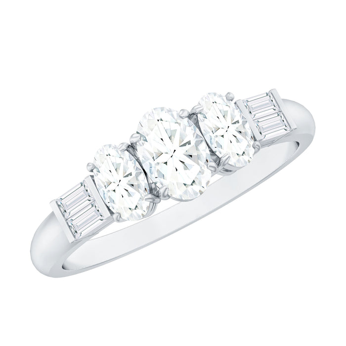 Celebrate a love that grows stronger with time with this elegant Moissanite Anniversary Ring. Thoughtfully designed to mark a special milestone, this Three Stone Moissanite Ring beautifully combines classic style with a meaningful message. The three oval shaped moissanite stones at the center symbolize your past, present, and future together, each one shining bright with D color and VS1 clarity for unmatched brilliance and sparkle. The center oval stone measures 4X6 MM and is flanked by two slightly smaller 3X5MM oval stones, creating a balanced and eye-catching design. On either side of the main stones are baguette cut moissanites set horizontally to add a modern touch, giving the 3 Stone Anniversary Ring a sophisticated finish. This Oval Moissanite Ring is a timeless reminder of your journey as a couple. Whether you are celebrating your first anniversary, ten years, or more, it is a meaningful way to show your love and commitment. Its elegant style makes it perfect for daily wear or special occasions, and it pairs easily with other jewelry pieces. Give the gift of sparkle and love with this stunning Past Present and Future Ring.