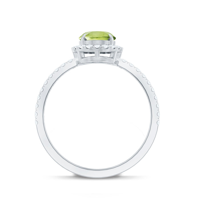 An appealing Peridot in a prong setting is surrounded by a glimmering Diamond halo. The shoulders are also adorned with Diamond for added sparkle. Crafted in gold, this Oval Peridot Engagement Ring is simply luxurious. Make your significant other extremely happy by presenting her this Peridot Diamond Ring.