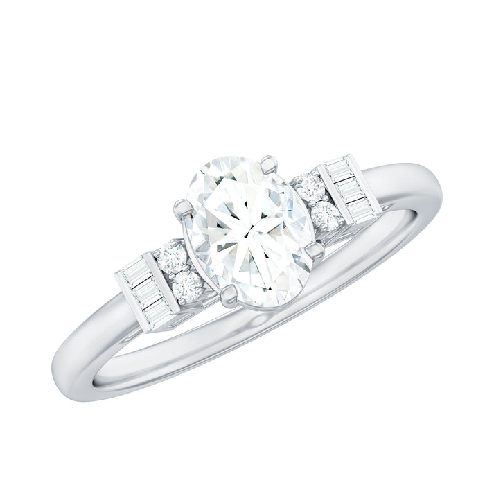 This beautiful Moissanite Engagement Ring is designed to make your special moment truly unforgettable. At the center of this Classic Engagement Ring is a sparkling 5X7 MM oval shaped moissanite set in prong setting. What makes this ring even more stunning are the side stones. On each side of the center moissanite, you will find a combination of round and baguette cut stones. Together, they create a beautiful design and extra shine that catches the eye from every angle. The smooth and polished band gives the Oval Engagement Ring a neat and comfortable fit, perfect for everyday wear. Every detail of this Oval Moissanite Ring has been carefully designed to make it special, from the balanced setting to the brilliant arrangement of side stones. Made with D-VS1 quality moissanite, this engagement ring offers the look of luxury while also being an ethical and budget-friendly choice. It is a beautiful way to celebrate your love and start your journey together. Whether you are planning a proposal or choosing the perfect ring together, this oval moissanite engagement ring is a meaningful and elegant choice that will be treasured for a lifetime.