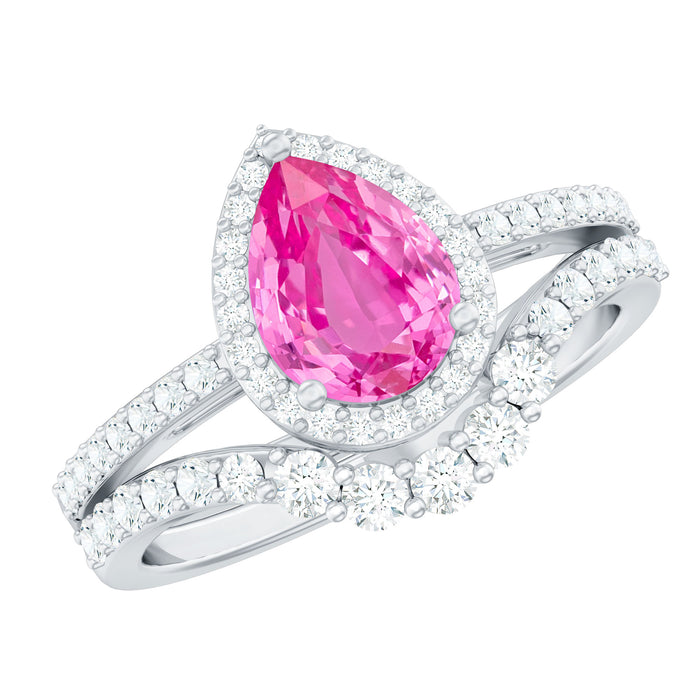 Embrace the radiant symbol of love with this dazzling Created Pink Sapphire Ring Set. Adorned with a mesmerizing Pear Cut Created Pink Sapphire gracefully placed in a Prong Setting, and accompanied by glistening Moissanite accents on the Ring Set, this jewelry ensemble captures the essence of romance. Skillfully crafted from exquisite Gold, this Designer Ring Set serves as a radiant reminder of the deep affection shared between you and your partner, sparkling with every beat of your hearts.
