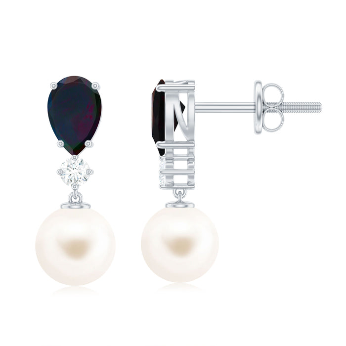 Behold the captivating beauty of these Freshwater Pearl Earrings, a stunning piece of jewelry that instantly mesmerizes. A Round Shape White Freshwater Pearl delicately hangs as a drop, accentuated by a lustrous Pear Cut Black Opal on top, and further adorned with Moissanite for a touch of luxury.