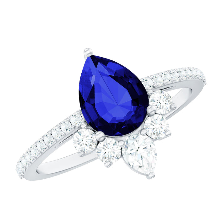 Declare your love with this exquisite Crown Solitaire Ring, featuring a captivating Pear Cut Created Blue Sapphire complemented by Diamond accents. This Created Blue Sapphire Crown Ring is a bold and stunning accessory, destined to be proudly flaunted on her special day. It symbolizes the beauty and grandeur of your commitment.