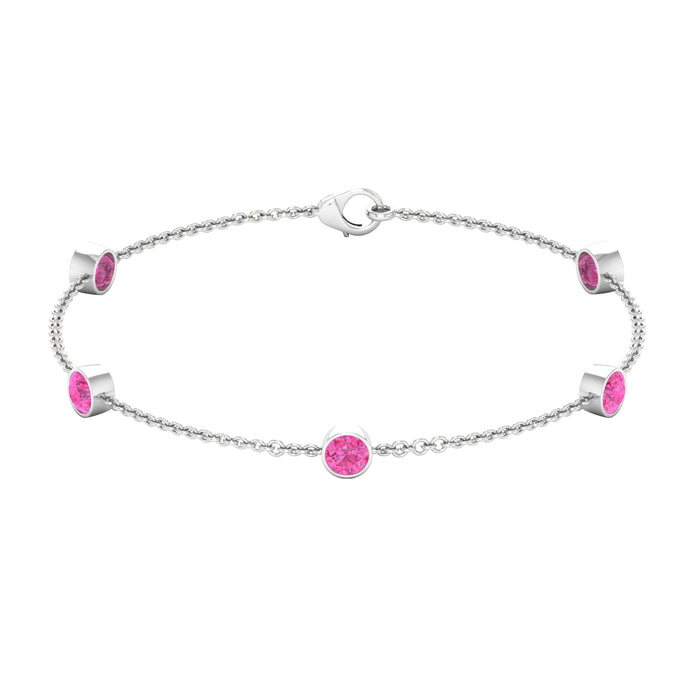 Enhance the sophistication of your wrist with this minimalist Pink Sapphire Bracelet. This stunning accessory showcases 5 mm round Pink Sapphire gemstones meticulously arranged along a delicate chain in a bezel setting, producing a subtle yet enchanting sparkle. The Lobster Claw Closure guarantees a secure fit, making this Station Chain Bracelet perfect for daily wear or special events. Rosec Jewels is committed to timeless beauty and ethical sourcing, rendering this Stackable Bracelet an ideal combination of luxury and responsibility. Crafted with versatility in mind, this Minimal Chain Bracelet can be worn solo or layered with other items for a fashionable, stacked appearance. Its classic design makes it an excellent gift for her on any occasion—be it a birthday, anniversary, or simply a heartfelt gesture to express your love. Embrace the enduring elegance and versatility of this Station Bracelet, which ensures you will always appear effortlessly chic and stylish. Its brilliant sparkle is an appealing choice for those in search of a refined enhancement that adds a hint of luxury without overwhelming your look. The grace and beauty it reflects in you narrate your story and attract attention.