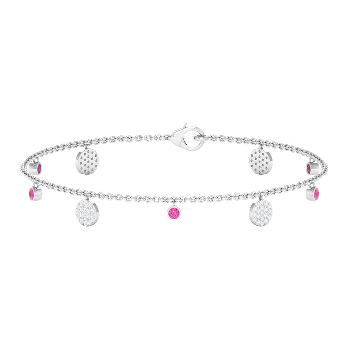 Embrace elegance with our Chain Charm Bracelet, embellished with Round Pink Sapphires set in Bezel Setting, interspersed with diamond-encrusted round discs. This Station Chain Bracelet is equipped with a Lobster Claw clasp, enabling you to complement your preferred attire and radiate a celestial charm on your special occasion, appearing utterly captivating. The high-quality jewelry packaging ensures that the jewelry remains safeguarded throughout shipping and delivery, making it perfect for significant occasions such as birthdays, International Womens Day, Mothers Day, Valentines Day, graduations, and Thanksgiving. This Disc Charm Bracelet features a reliable lobster clasp, with a secure and comfortable fit. It represents love, strength, and inner brilliance, making it a considerate gift for yourself or a loved one. Its lightweight and versatile design offers the ideal amount of sparkle without being excessive. You can wear this Layering Bracelet alone for a minimalist appearance or combine it with another bracelet for a striking statement; in either case, it will provide you with the perfect style to shine in any occasion.