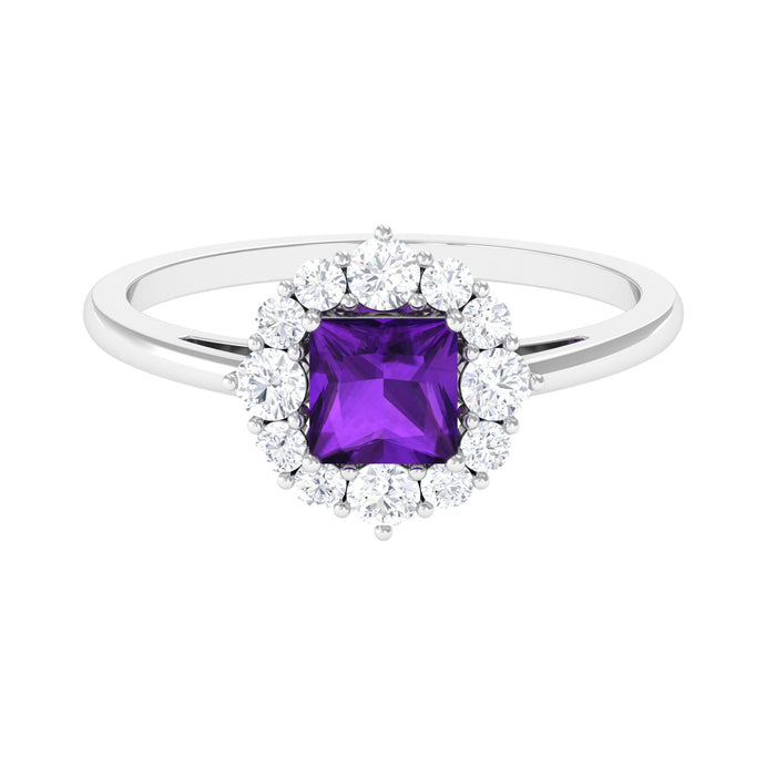 Embrace regal charm with this Amethyst Ring, encircled by a Diamond halo. A striking combination of royalty and brilliance, fit for a true queen.