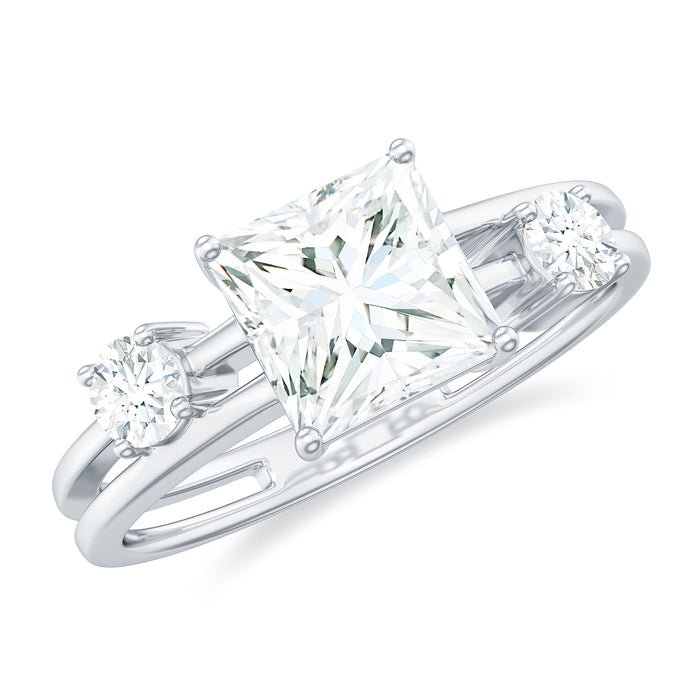 Embrace modern luxury with this stunning Lab Grown Diamond Engagement Ring. Showcasing a brilliant EF-VS Quality 6 MM Princess Cut Lab Grown Diamond set in Prong Setting, this Solitaire Engagement Ring harmonizes timeless elegance with a bold, contemporary flair. The sleek double band design introduces depth and a trendy twist, making it a remarkable choice for brides who value both classic charm and modern style. Features two sparkling round shape diamond stones of 3 MM, creating a unique, layered appearance that is both sophisticated and edgy. Every aspect is meticulously designed to guarantee lasting quality and style. Ethically sourced and skillfully handcrafted, this Princess Cut Engagement Ring exudes stunning brilliance and sophistication. Whether you are planning a romantic proposal or commemorating a special occasion, this Square Engagement Ring symbolizes love that is as timeless as it is stylish. Beautifully packaged in an elegant jewelry box, it is prepared to make your significant moment even more unforgettable. This 1 Carat Diamond Ring for Women promises a lifetime of modern elegance she will treasure forever.