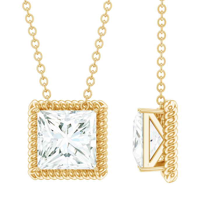Turn everyday moments into something special with this dazzling Solitaire Moissanite Necklace, thoughtfully designed to bring elegance with a touch of boldness. Crafted in 14K yellow gold plated silver, this Square Necklace is all about refined style with a vintage twist. At the center is a stunning 7 MM princess cut D-VS1 quality moissanite, securely set in prong setting that lets the stone shine from every angle. Surrounding the stone is a twisted rope detail, giving it a unique texture and a slightly antique-inspired feel without overdoing it. The Princess Cut Necklace is suspended gracefully from a chain, ensuring it rests comfortably against the neckline. Whether you are dressing up for a formal event or adding a little sparkle to your everyday outfit, this piece fits right in, bold enough to stand on its own, yet versatile enough to be layered with other favorites. It is easy to wear, incredibly chic, and a subtle nod to personal style without being too loud. Whether it is a birthday, anniversary, or a thoughtful gift to yourself, this 2 carat Moissanite Necklace is made to be treasured. Its statement-making design and delicate craftsmanship make it a must-have in every jewelry lover’s collection.