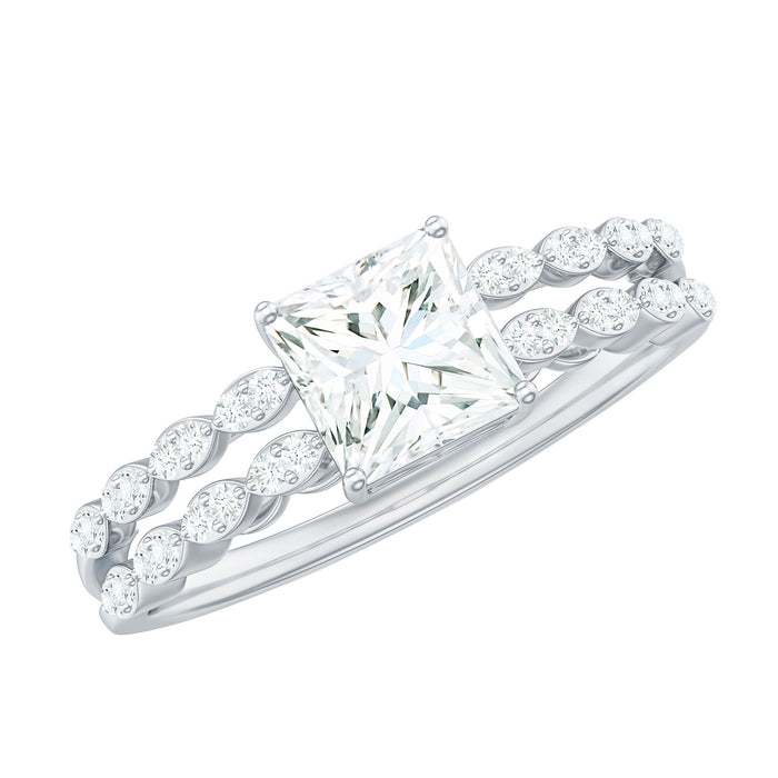 The elegant Princess Cut Cubic Zirconia is held in 4 Prong Setting. It is gorgeously flanked by Zircon Double Band, creating a minimal charm of this ring. This Simulated Diamond Engagement Ring is crafted in Gold for luxurious touch. The sparkle of this Cubic Zirconia Engagement Ring is what captivates people.
