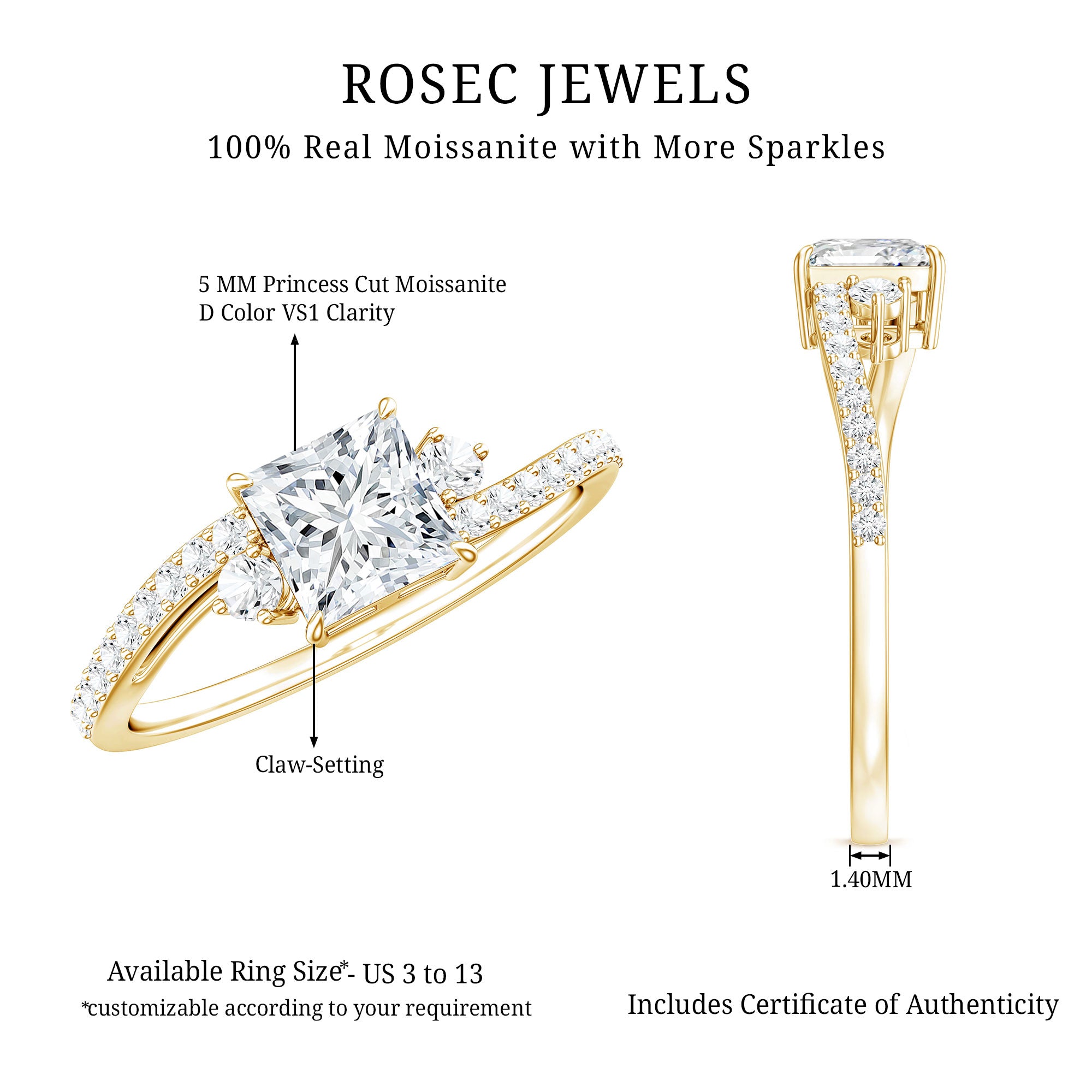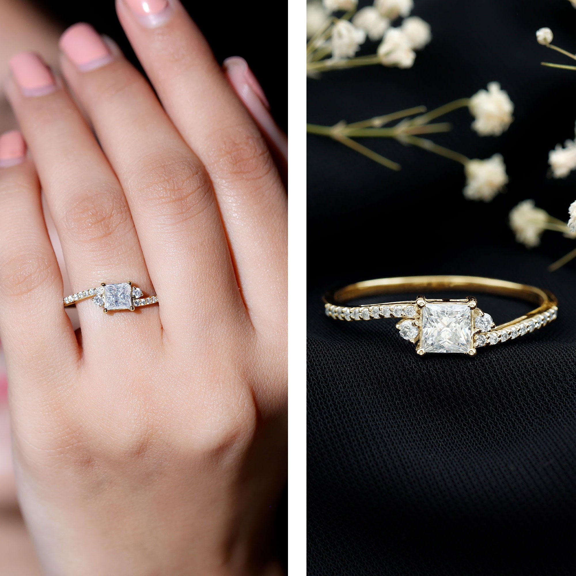 Want to make the moment special with a hint of shine, here is a Moissanite Engagement Ring, perfect for your special day. The heart of the ring is decorated with 5 MM Princess Cut Moissanite delicately placed in Prong Setting. The center stone is adorned with round petite moissanite shank. This Bypass Ring is the perfect choice to celebrate your everlasting love story. The Square Engagement Ring reflects the shine of D-VS1 quality Moissanites making it the perfect dazzler for the occasion. Present this princess cut engagement ring to her and witness her priceless expression.