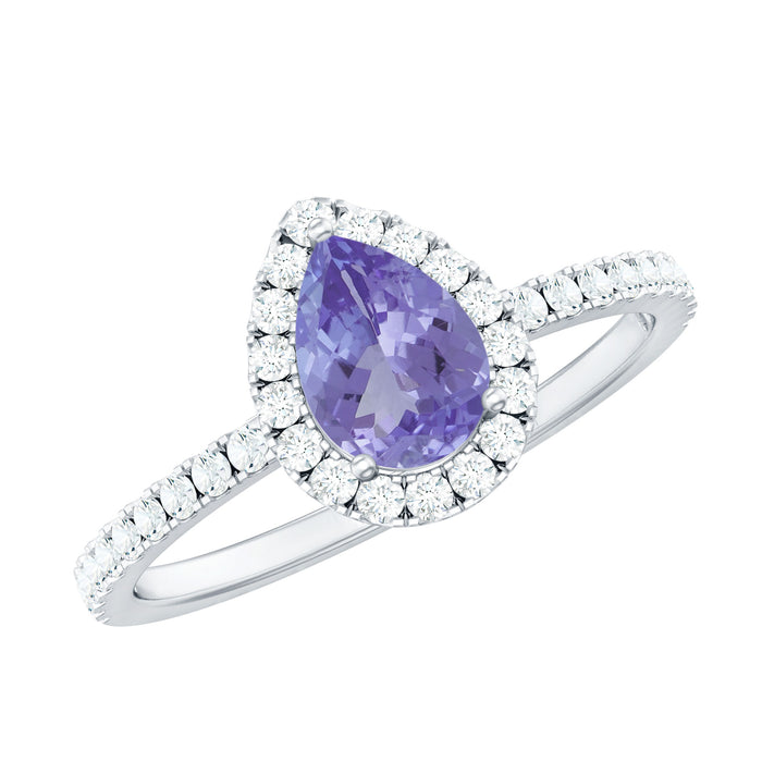 This Tanzanite Engagement Ring tells a love story in the most graceful way, blending soft romance with timeless sparkle. At its center shines a real 5X7 mm Pear Shape Tanzanite set in 3 Prong Setting, glowing with dreamy blue and violet tones that feel both rare and deeply emotional. The Teardrop shape adds a sense of movement and elegance, symbolizing tears of joy and moments that take your breath away. Encircling the center stone, a delicate Diamond Halo catches the light beautifully, enhancing the natural brilliance of AAA Quality Tanzanite. Along the band, dainty Diamond stones are carefully studded, creating a gentle shimmer that follows every curve of the ring. The overall design feels light, romantic and effortlessly elegant, perfect for someone who loves subtle luxury with heartfelt meaning. This Teardrop Engagement Ring is a ring made for quiet glances, warm smiles, and promises meant to last a lifetime. Presented in a signature jewelry box and available in various ring sizes, this Tanzanite and Diamond Ring is a beautiful expression of eternal love, designed to be cherished today, tomorrow and always.