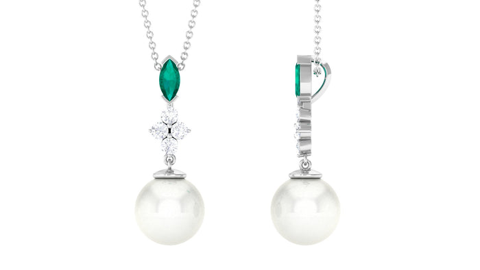 Achieve a simple yet sophisticated look with this elegant Freshwater Pearl Vintage Pendant. This pendant features a 10 MM Freshwater Pearl, with Round Shape petite Moissanite, and a stunning 4X8 MM Marquise Shape Emerald. This pendant necklace is the perfect gift for a Gemini woman who appreciates timeless and elegant jewelry. This pendant is sure to become a treasured piece in any jewelry collection. This Pearl Dangle Necklace exudes a classic shine of AAA quality pearl making it perfect for embracing the special look. The pendant will be delivered to you in a jewelry box with the certificate of authenticity.
