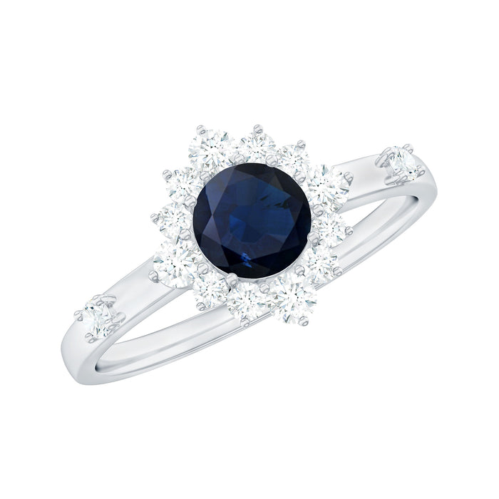 Enhance your ensemble with this charming Solid Gold Blue Sapphire Ring. The ring features a Round Shape Blue Sapphire in the center, embellished in a Halo Style with Diamond Gems, creating an enchanting and captivating effect. This Classic Gold Ring with Blue Sapphire adds a touch of elegance to any outfit, making it an excellent addition to your jewelry collection.