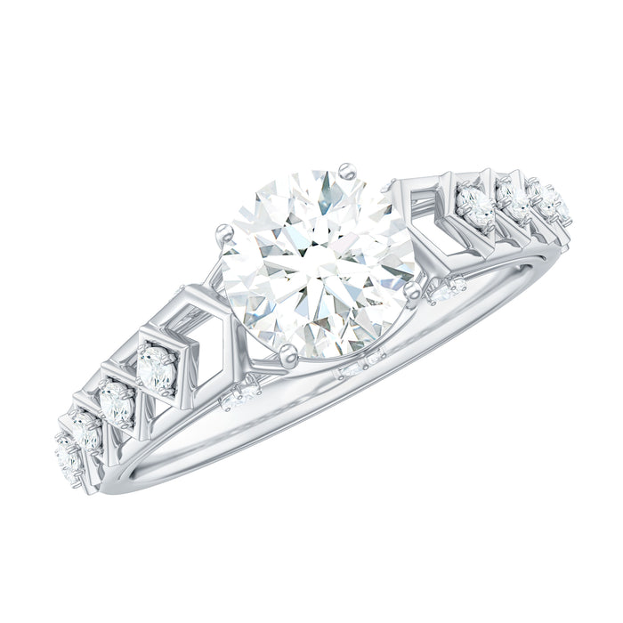 A Vintage Moissanite Engagement Ring for the couples that are all about old-school gestures of love! Boasting of sparkles, it features a Single Stone of Round Cut Moissanite that steals all the attention. Inspired by abstract Art Deco patterns, this Engagement Ring looks like a true piece of art that is beautified by side-stones of Round Cut Moissanite.