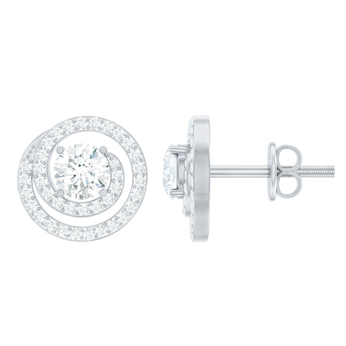 Add sparkles to the outfit with these Moissanite Swirl Earrings, precisely crafted with 14K White Gold Plated Silver. These earrings feature 4 MM Round Shape placed at the center of a metallic swirl studded with smaller Moissanite stones. These Stud Earrings reflect the dazzling shine of D-VS1 quality Moissanite securely placed in Prong Setting. These Earrings with Screw on Backs will stay on place throughout the day and will be delivered to you in a signature velvet pouch to keep it safe and dust free when not in use. A certificate of authenticity will also be sent to you with these Moissanite Earrings, ensuring the quality.