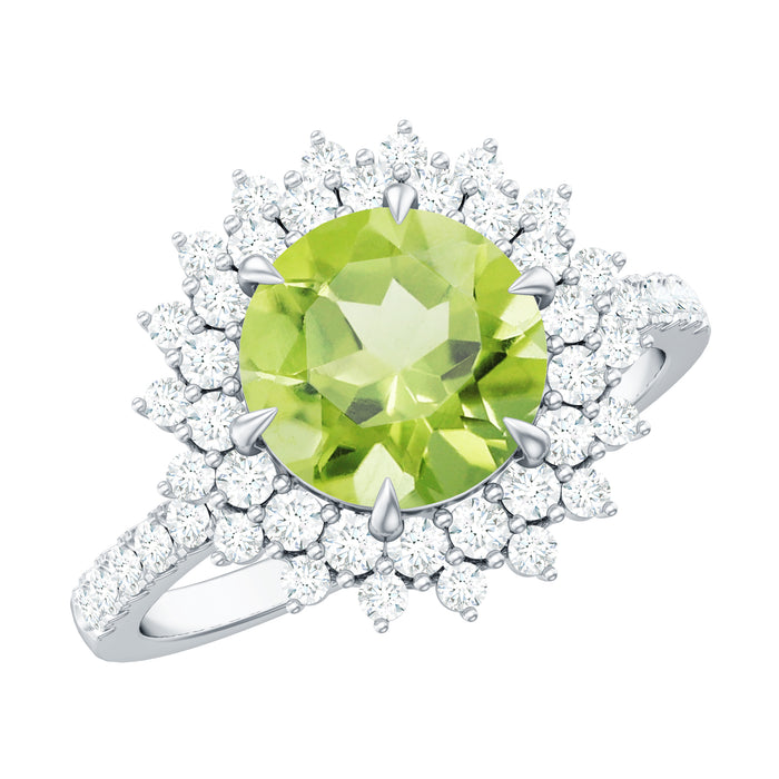 Crafted with a sumptuous appeal, this engagement ring features a stunning round Peridot held in a six-claw prong setting, surrounded by a captivating cluster halo of moissanite stones. The intricate design of this Peridot statement ring exudes a regal appearance and is crafted in gold. Impress your lady with your exquisite taste by gifting her this beautiful Peridot engagement ring.