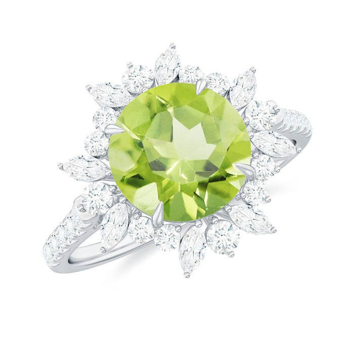 Make a statement at your next cocktail party with this radiant cocktail ring. Sculpted in gold with a marquise and round cut moissanite accent setting, this stunning ring features a beautiful floral peridot and moissanite design. Add an extra touch of elegance to your look with this amazing and shiny piece.