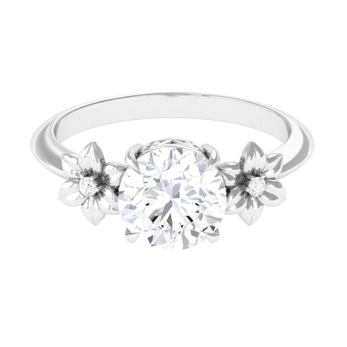 Remind your beloved of your love with this stunning floral solitaire ring, crafted from solid gold. The centerpiece of the ring is an 8 MM round-cut Zircon, beautifully set in a claw setting. Adding to its elegance, the engagement ring is embellished with round-cut cubic zirconia in a 6-prong setting as side stones. With its exquisite design and quality craftsmanship, this solitaire ring is sure to be treasured for years to come.