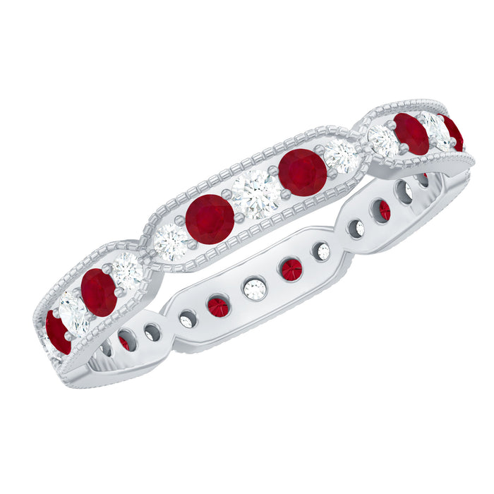 An Amazing and Classic Ruby Diamond Alternating Ring embellished with Round Shape Ruby and Sparkling Round Shape Diamond is set in the alternative pattern. The beaded design makes this ring more beautiful. A phenomenal ring is a perfect gift for your lovely lady.