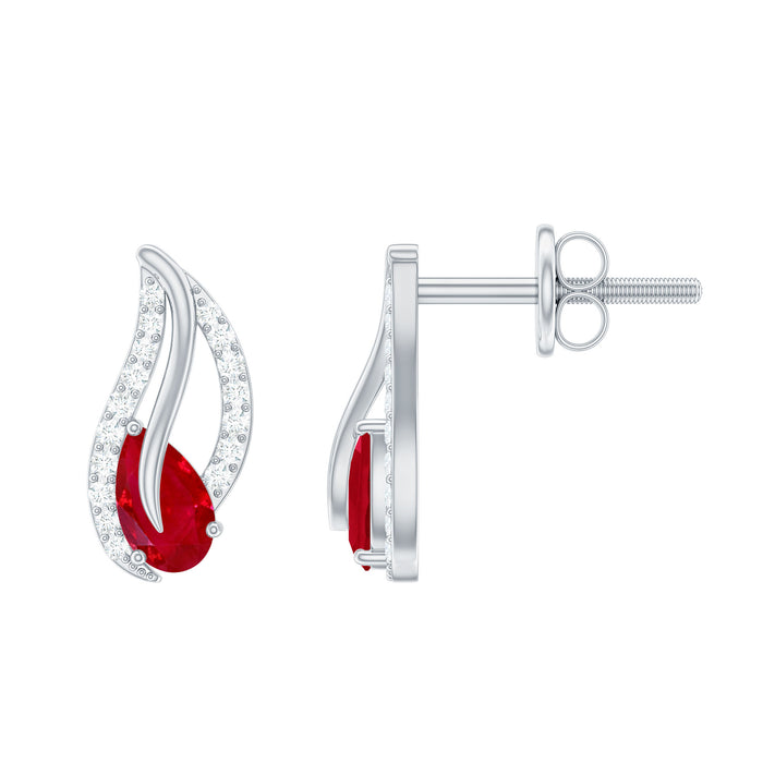 It is a pair of Leaf Stud Earrings for Women featuring Pear Cut Ruby embellished in Prong Setting with Round Shape Diamond stones embellished in Pave Setting. They are also known as Modern Earrings.