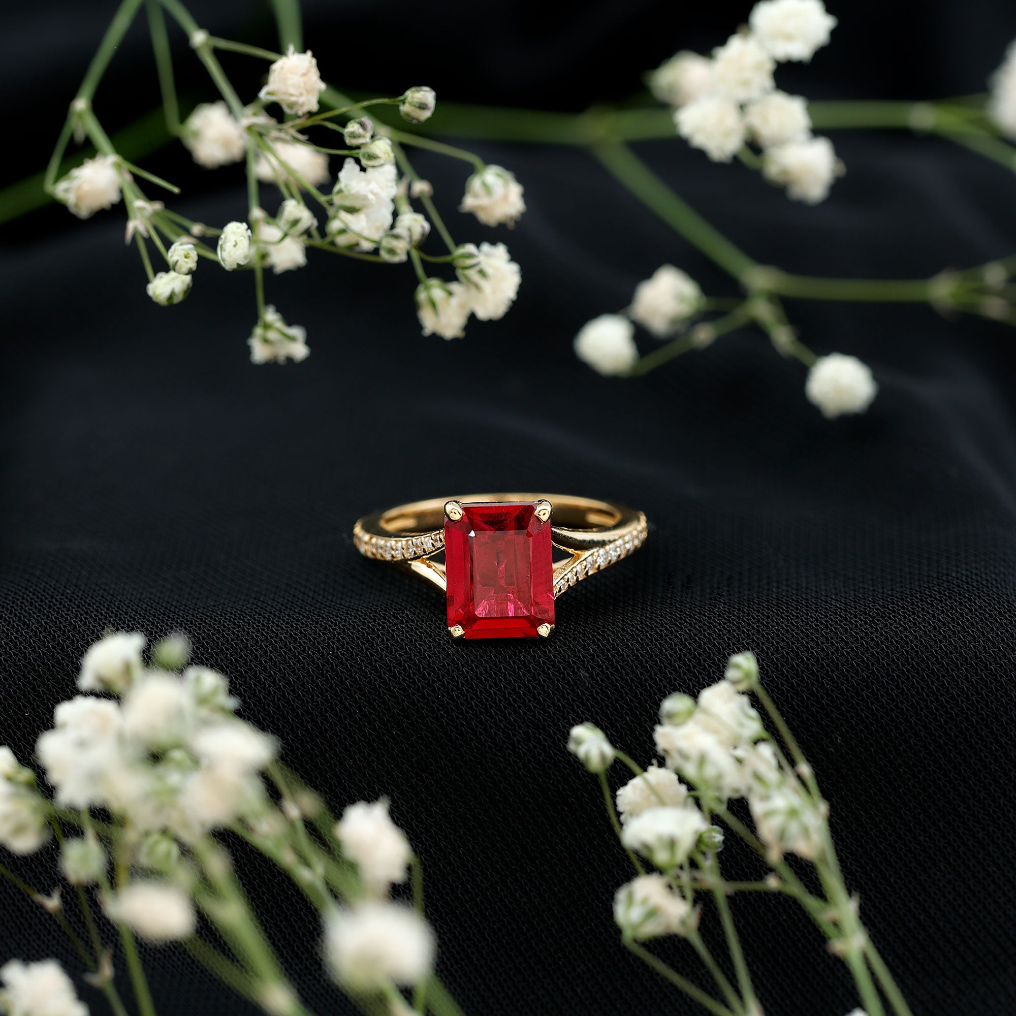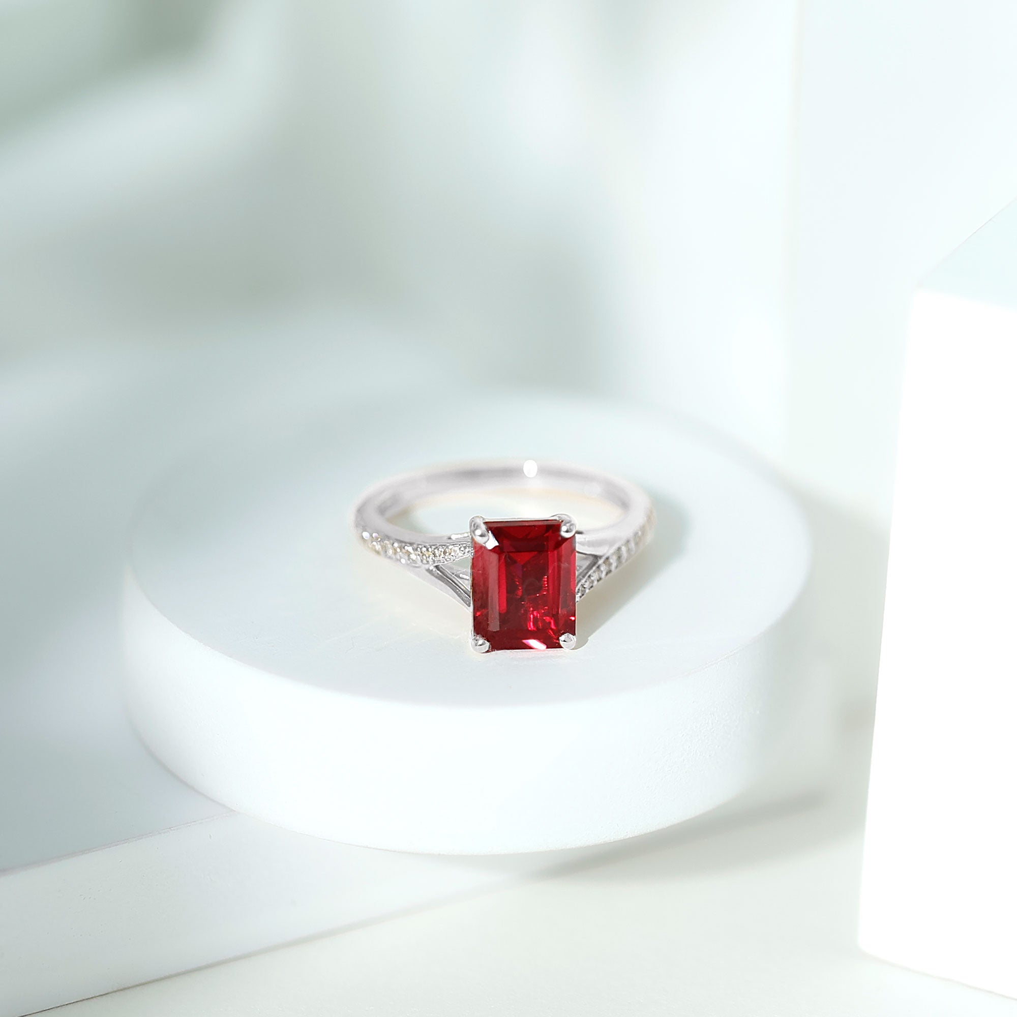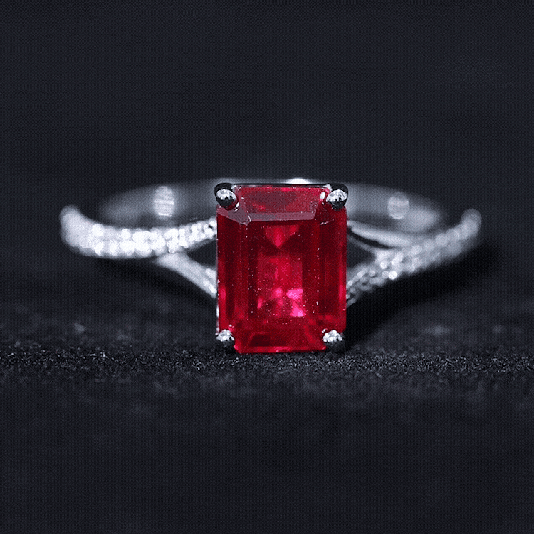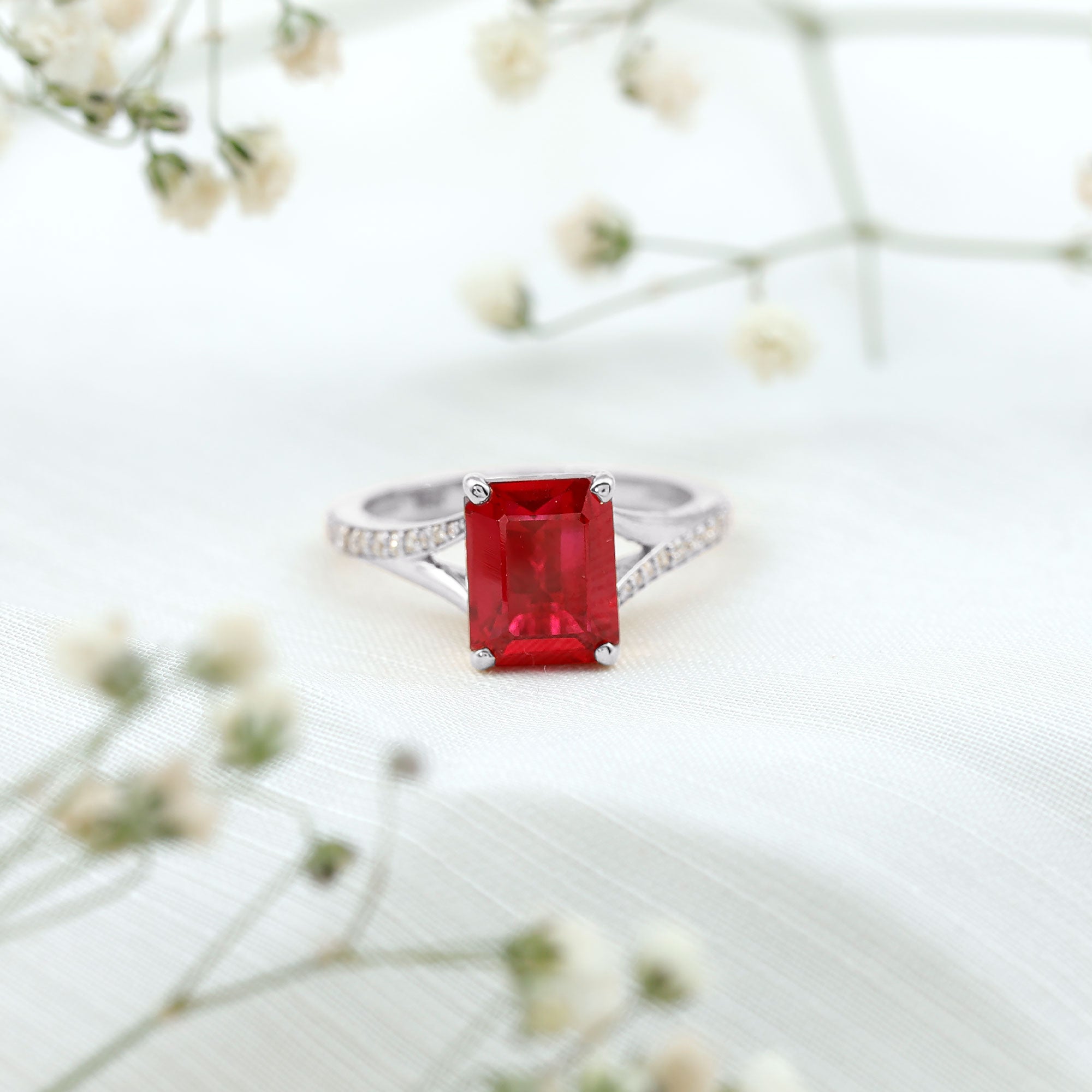 Effortlessly stylish, this Split Shank Ring features a Emerald Cut Created Ruby and Round Shape Diamond. The Created Ruby Solitaire Ring is the perfect choice for any woman seeking a timeless and elegant piece to adorn her finger.