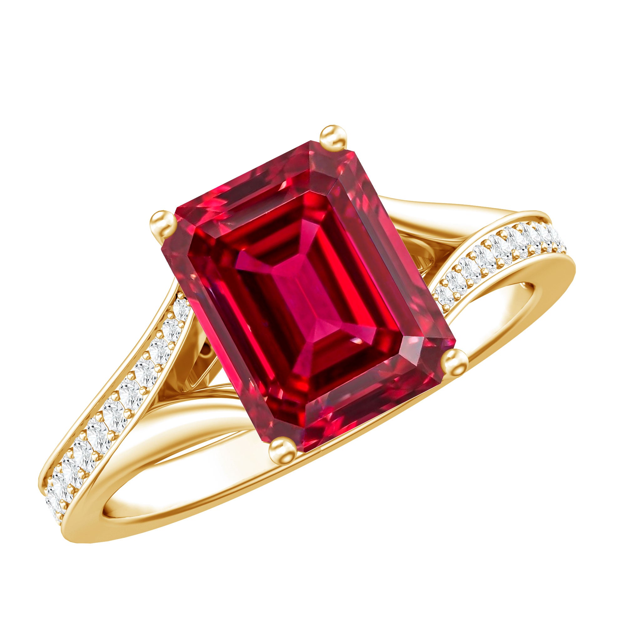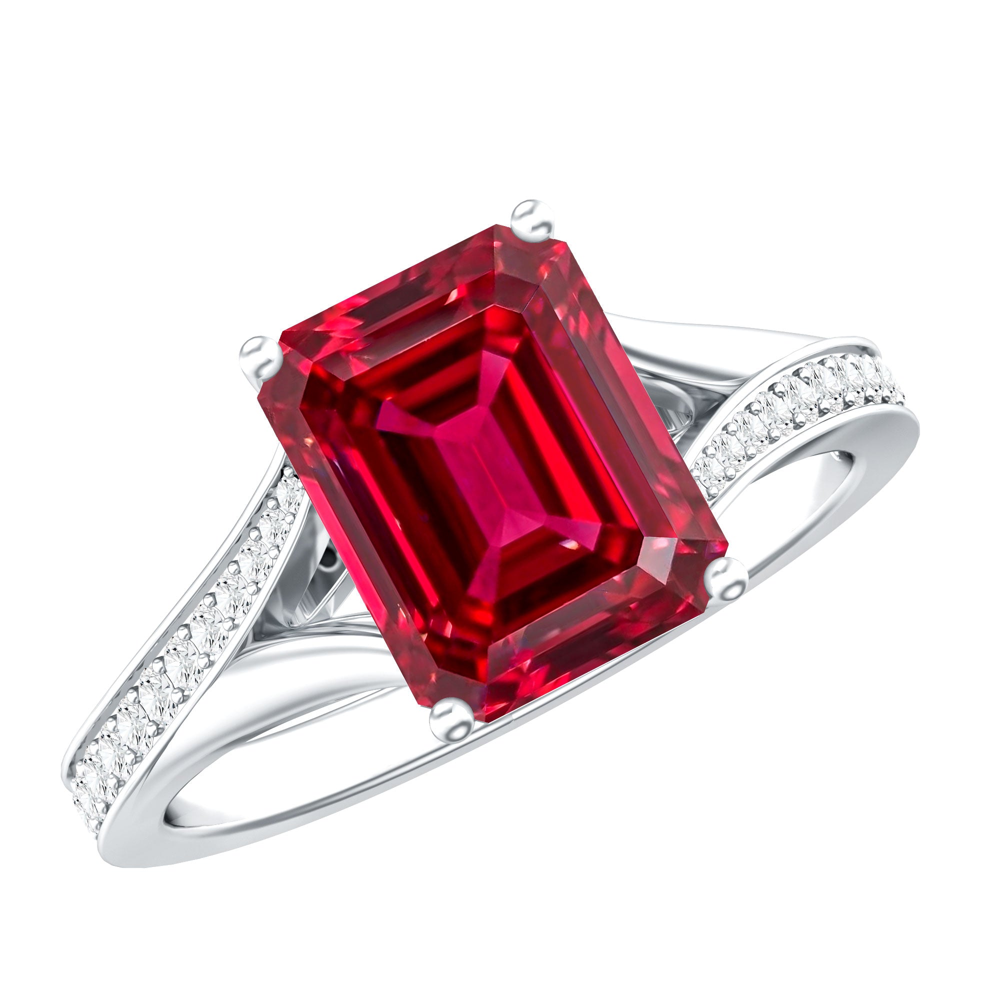 Emerald Cut Lab Grown Ruby and Diamond Ring with Split Shank