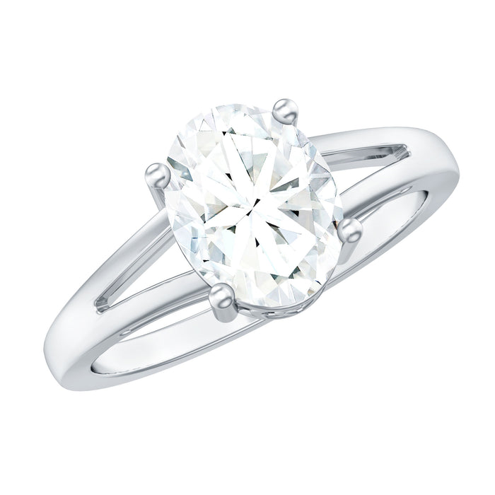 The Solitaire Oval Cut Moissanite Split Shank Engagement Ring is designed for those who appreciate classic elegance with a subtle architectural detail. The oval center stone offers an elongated silhouette that flatters the finger, while maintaining the timeless simplicity of a solitaire setting.