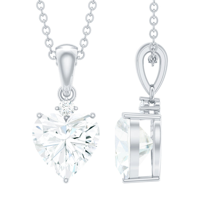 Present this Moissanite Heart Pendant to her as a token of love. This pendant features an 8 MM Heart Shape Moissanite topped with the Round Shape Moissanite embedded in the 14K White Gold Plated Silver. This Solitaire Pendant beholds the classic shine of D-VS1 Quality Moissanite securely placed in Prong Setting. The pendant is accentuated with the standard bail and dangles in a sturdy cable chain, which makes it beautifully sit on the neckline. This Chain and Pendant will be delivered to you in a premium quality velvet pouch with the certificate of authenticity.