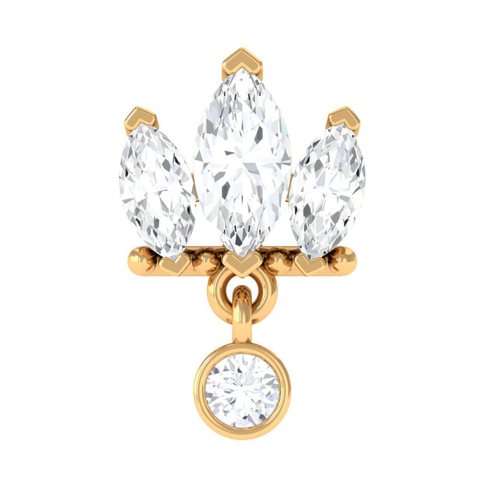 - This earring features three marquise shape diamonds set in prong setting on the top, while a dainty round shape diamond hangs as a drop.