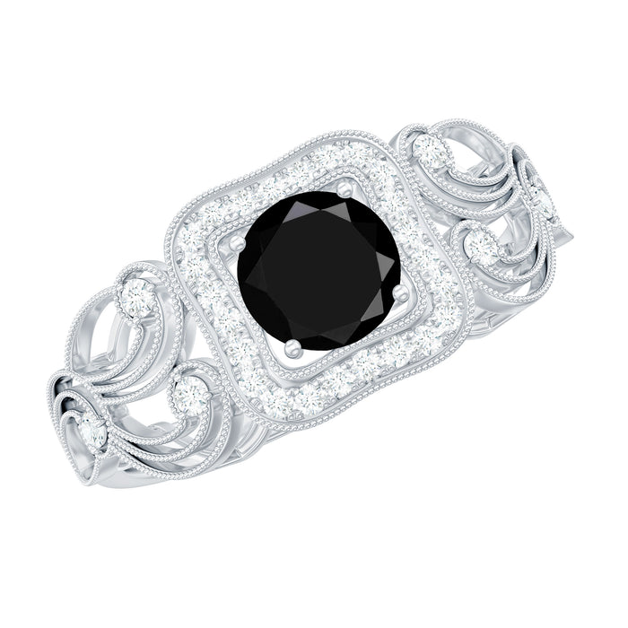 An Amazing and Fabulous Vintage Engagement Ring is a perfect gift for your lady. This Engagement Ring is decorated with Round Shape Created Black Diamond in the center and a Round Diamond in a halo and side stone style. The milgrain floral design set with Diamond stones magnifies the piece. This Created Black Diamond Engagement Ring is mounted in Gold Metal.