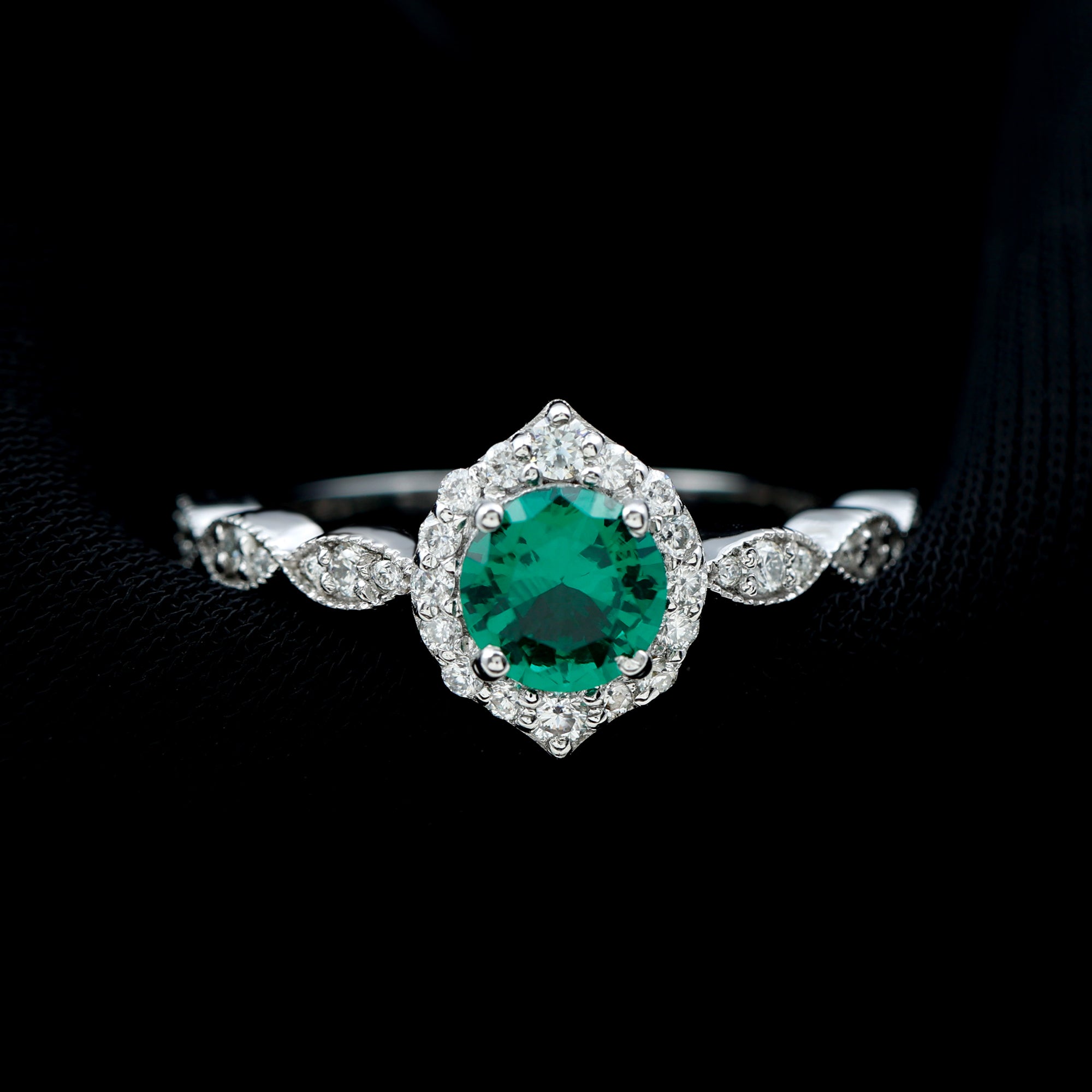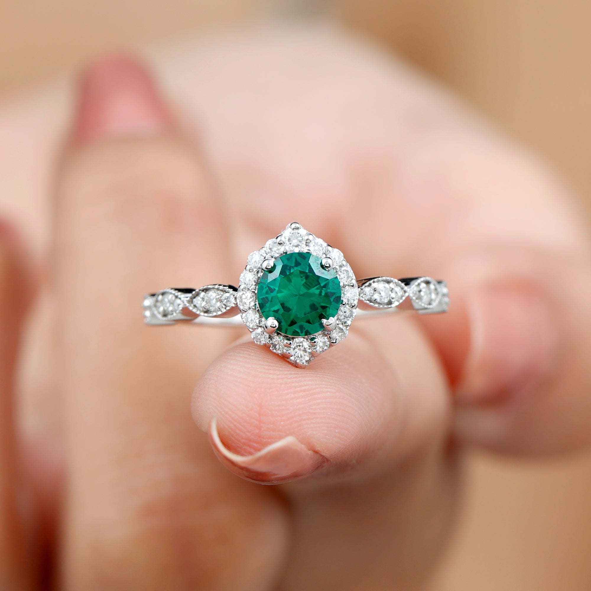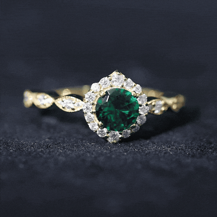 Express your profound feelings of love and affection by gifting your beloved this Vintage Inspired Emerald Engagement Ring. This stunning Antique Looking Ring features a vibrant 6 MM Round Shape Lab Created Emerald at the center, radiating its beautiful green hue, and surrounded by an exquisite Round Shape Diamond Halo. Additional diamonds are placed in a delicate scalloped pattern band, and fine milgrain detailing along the edges gives the piece a vintage inspired look. Crafted from AAAA quality lab grown emerald and HI-SI quality diamonds, this Halo Engagement Ring is a perfect fit for women who appreciate antique and artistic jewelry. Its intricate design and vintage-inspired aesthetic make it a truly unique piece that your partner will cherish for a lifetime. Whether you are marking a birthday, anniversary, engagement, or simply giving a thoughtful gift, this design fits any meaningful occasion. Lightweight and comfortable to wear, this Emerald and Diamond Ring has a simple yet eye-catching look. Its classic shape and quality craftsmanship make it a piece you will enjoy for years.
