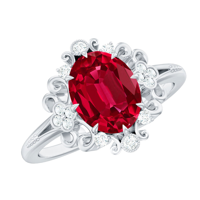 This elegant Vintage Inspired Engagement Ring combines timeless beauty with a touch of modern charm. At its heart shines a breathtaking 8X10 MM oval cut lab created ruby, securely set in claw setting. Enhancing the center stone are brilliant diamond stones, beautifully placed within intricate vintage style patterns that add character to the design. The detailed craftsmanship gives the Oval Cut Engagement Ring a graceful and antique feel while maintaining a contemporary look. Every element, from the fine metalwork to the carefully set diamonds, is designed to highlight the ruby’s radiant color and sparkle. Perfect for the bride who appreciates tradition but also values individuality, this piece blends old-world romance with modern sophistication. It is versatile enough to complement both classic and contemporary bridal styles, making it a meaningful choice for a lifetime of love. Crafted with precision and care, this Lab Created Ruby and Diamond Engagement Ring is made to last and shine for years to come. It arrives in a beautiful jewelry box, ready for gifting, and includes a Certificate of Authenticity to ensure the quality and craftsmanship of your piece. With its rich color, sparkling details, and thoughtful design, this Vintage Ruby Ring is a true celebration of love and timeless beauty.