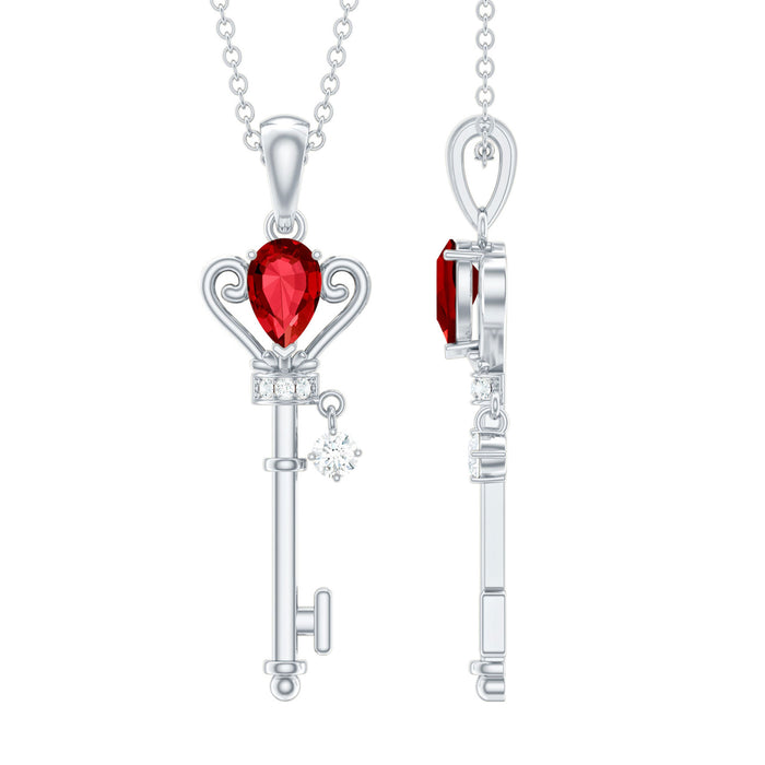 If you are a fan of antique jewelry, then this Vintage Key Pendant is sure to captivate you. Crafted from hallmarked metal, this Unique Pendant Necklace features a 4X6MM Pear Cut Lab Created Ruby delicately placed between a filigree design at the top of the key. Carefully arranged diamonds add to the charm of this Vintage Ruby Necklace, making it a perfect gift choice for your special someone. Made with Lab Grown Ruby of AAAA Quality, this Key Pendant Necklace offers the same color as natural gemstones, but more sustainably and thoughtfully. Whether you are buying it as a gift or treating yourself, this Ruby and Diamond Necklace is a lovely reminder of new beginnings and open doors. It comes in a beautiful jewelry box, ready to give or enjoy. Delicate, meaningful, and easy to wear, this Key to my Heart Necklace is a little piece of elegance you will love having in your collection.