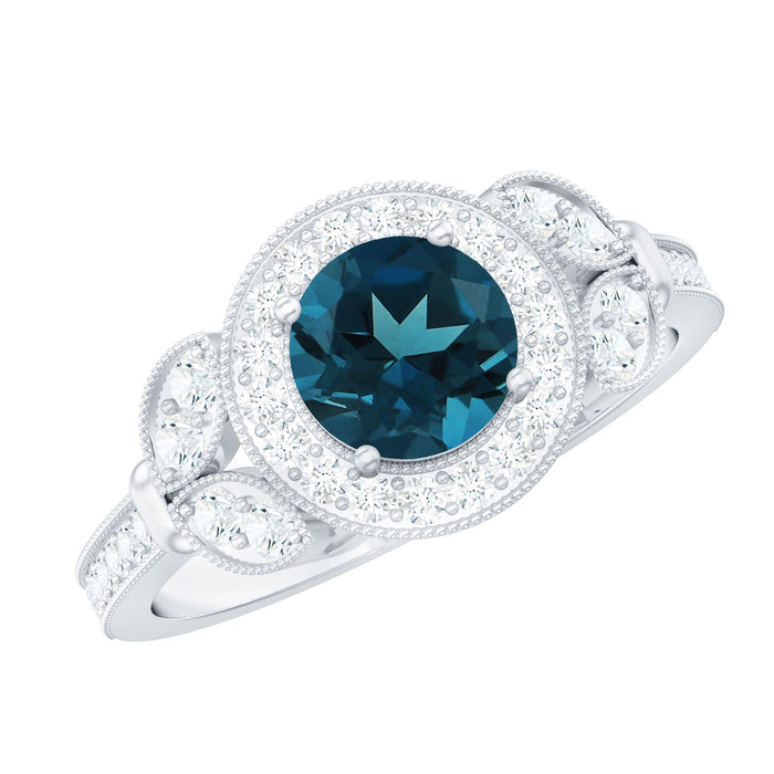 Enter a realm where everlasting love and timeless elegance unite in flawless harmony. This Vintage Inspired Engagement Ring showcases a breathtaking 7 MM round shape London Blue Topaz at its core. The blue topaz is securely held in prong setting, making it the focal point of the design. Encircling the central stone is a dazzling halo of diamonds that reflect light from every direction, enhancing its brilliance and sophistication. The band itself is a masterpiece, adorned with intricate beaded details and petite diamonds that impart a vintage charm. This Blue Topaz and Diamond Engagement Ring embodies the allure and romance of traditional craftsmanship while still feeling contemporary and unique for today’s bride. Ideal for those who appreciate vintage-inspired jewelry, this London Blue Topaz Ring narrates a story of eternity. It is available in various sizes to ensure a perfect fit and is elegantly packaged in a refined jewelry box, ready to become a treasured keepsake. With its AAA quality blue topaz, radiant HI-SI quality diamonds, and vintage-inspired design, this Retro Engagement Ring is a piece of your love story poised to be worn daily.