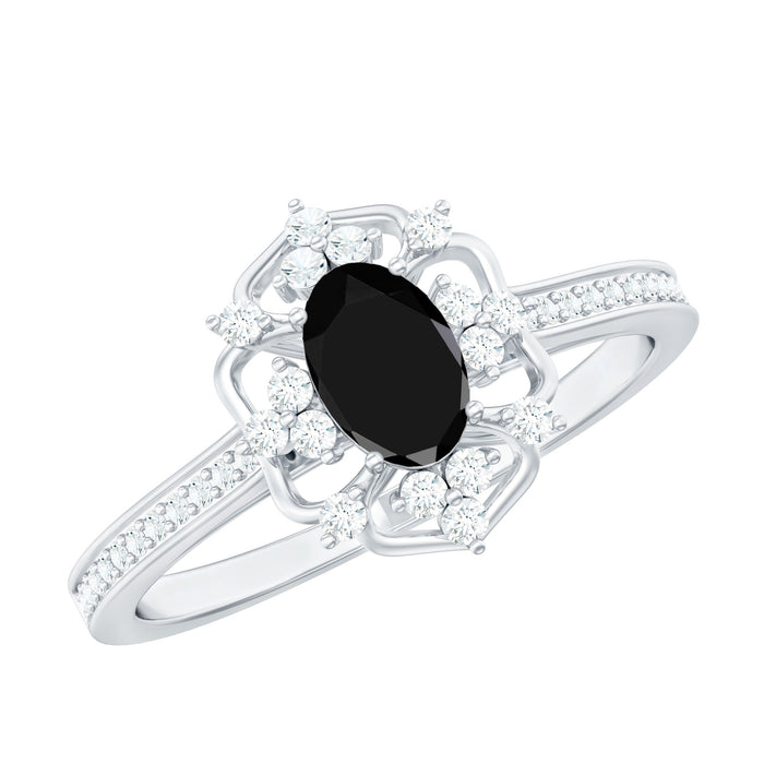 A perfect choice for anyone who loves timeless romance with a touch of old-world charm, this Vintage Inspired Engagement Ring tells a story that feels both classic and deeply personal. At its center, a striking 4X6 mm Oval Shape Black Spinel set in Prong Setting draws you in with its dark glow, creating a beautiful sense of mystery. Surrounding the center stone, delicate Diamond stones shimmer softly, enhancing the vintage inspired design without taking away from its elegance. Tiny Diamond stones continue along the band, catching the light with every movement and adding a subtle sparkle that feels graceful rather than bold. This Black Spinel Diamond Ring feels like a treasured heirloom, as if it has carried love stories through time and is now ready to begin a new one. The contrast between the deep AAA Quality Black Spinel and the gentle brilliance of HI-SI Quality Diamond stones creates a balance of strength and affection, perfect for a love that is both powerful and heartfelt. Thoughtfully crafted and presented in a signature jewelry box, this Oval Engagement Ring with Spinel made for a moment filled with emotion. With various ring sizes available, this Black Spinel Engagement Ring becomes a meaningful symbol of devotion, promise and a love meant to last forever.