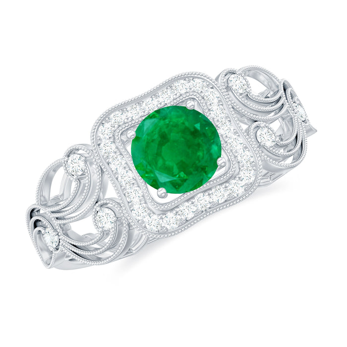 Bring the old-world charm to your modern love story with this enchanting Vintage Looking Engagement Ring, a masterpiece that beautifully bridges timeless romance and elegance. At its center lies a vivid 5 mm Round Shape Emerald set in Prong Setting, glowing with deep green brilliance, a gemstone long cherished as a symbol of hope, harmony and eternal love. Surrounding it, a Halo of sparkling Diamond stones enhances its radiant allure, while the Beaded Detailing and dainty Diamond stones along the band add an irresistible touch of vintage sophistication. Perfect for the woman who treasures classic beauty with a hint of nostalgia, this Emerald Diamond Engagement Ring captures the essence of forever in its intricate design. Whether it marks a promise, a proposal or a cherished milestone, this Halo Engagement Ring with Emerald is destined to become a keepsake passed through generations. Presented in an elegant jewelry box and available in various sizes, this exquisite Emerald Engagement Ring is ready to gift, a symbol of love that transcends time.