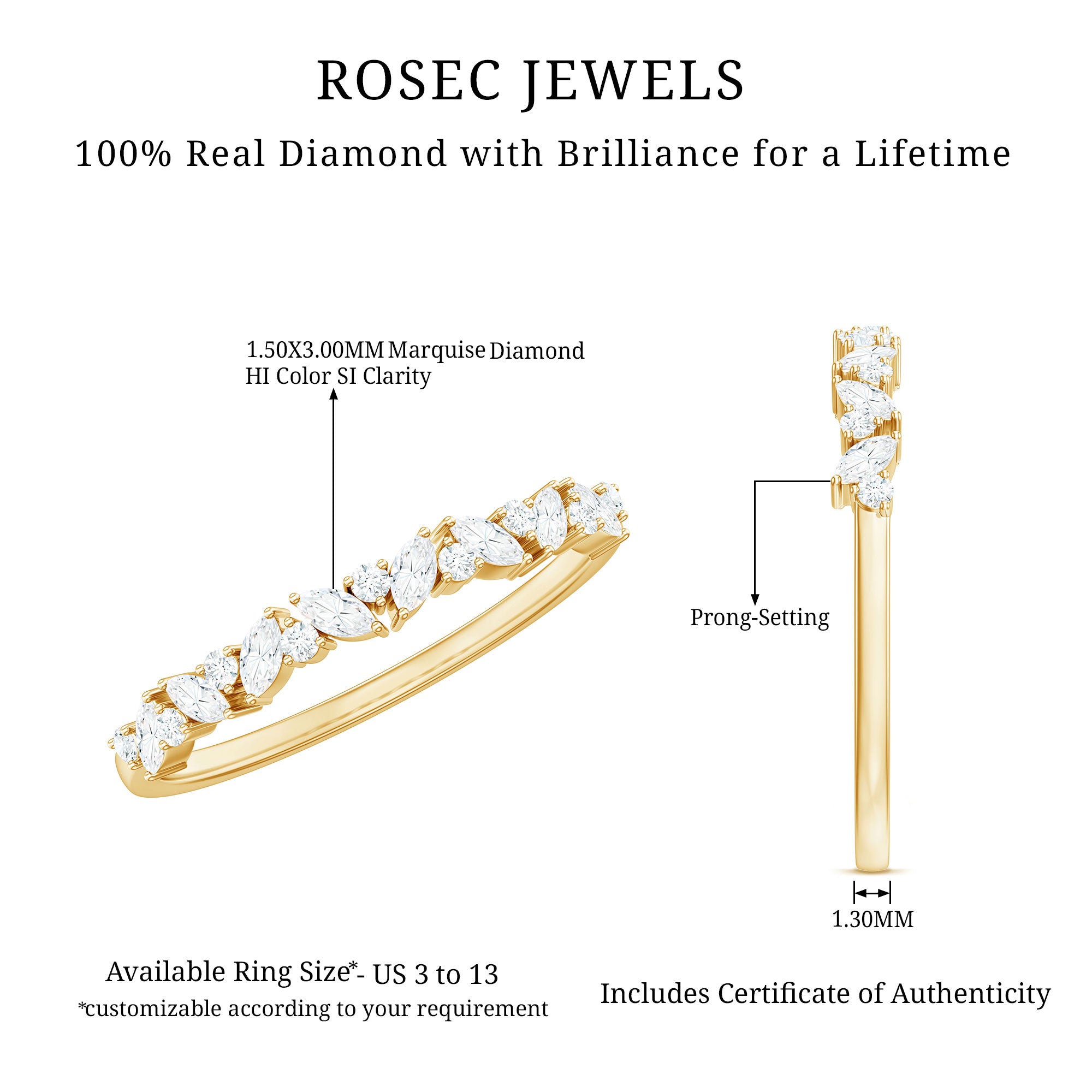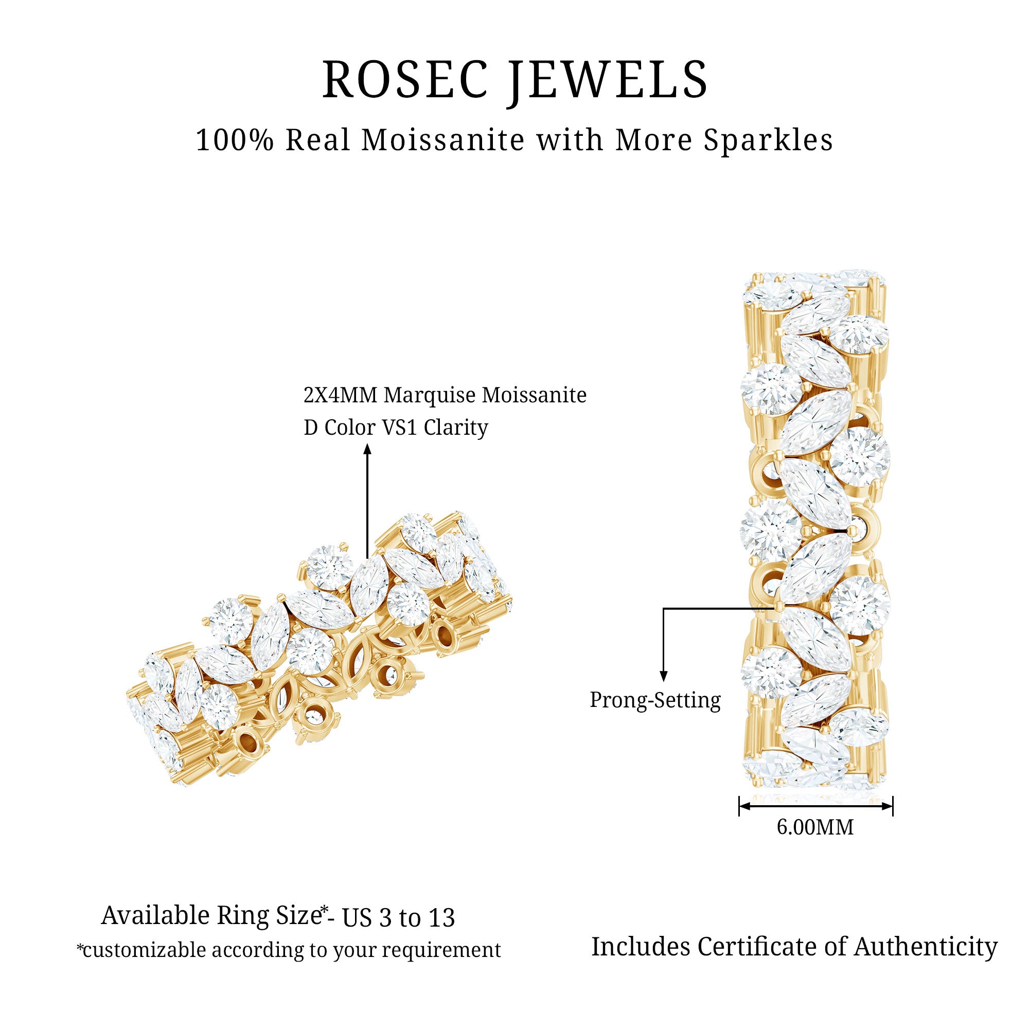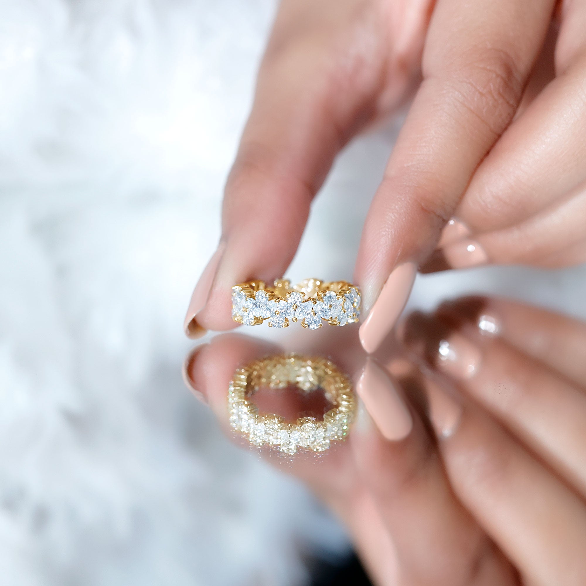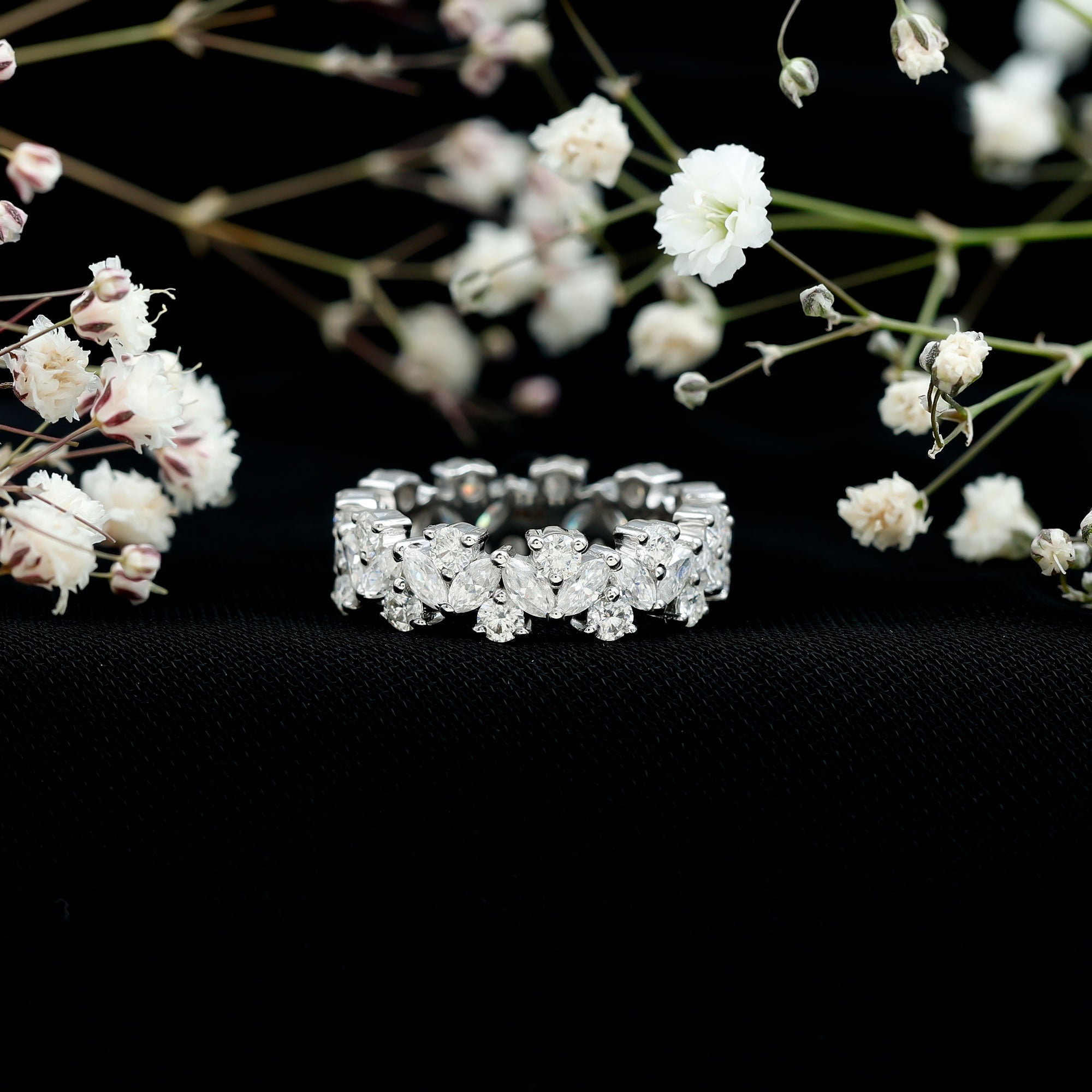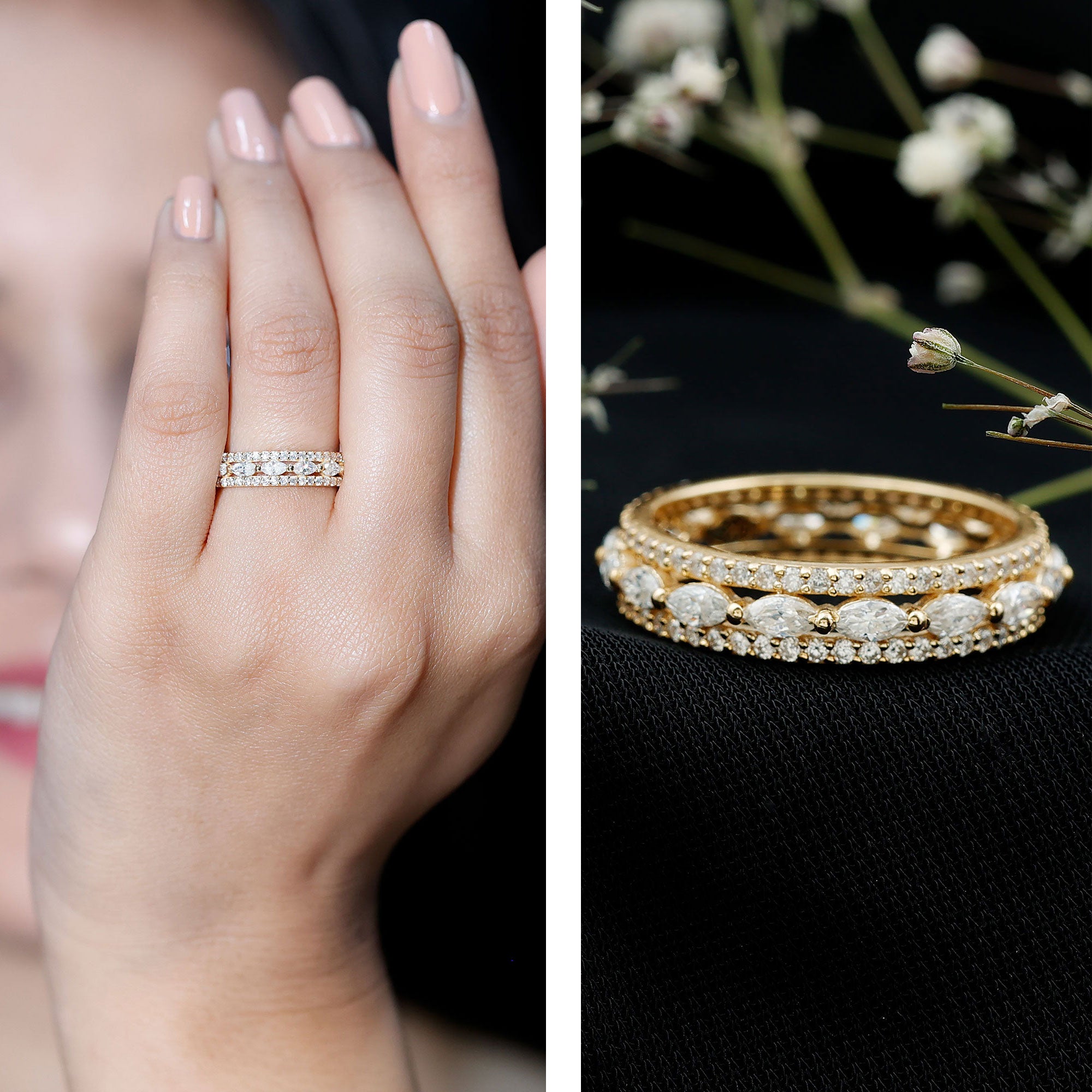 Mix it up with mixed-shape eternity bands! They use various stone shapes, like marquise and round cuts, for a unique and joyful look.