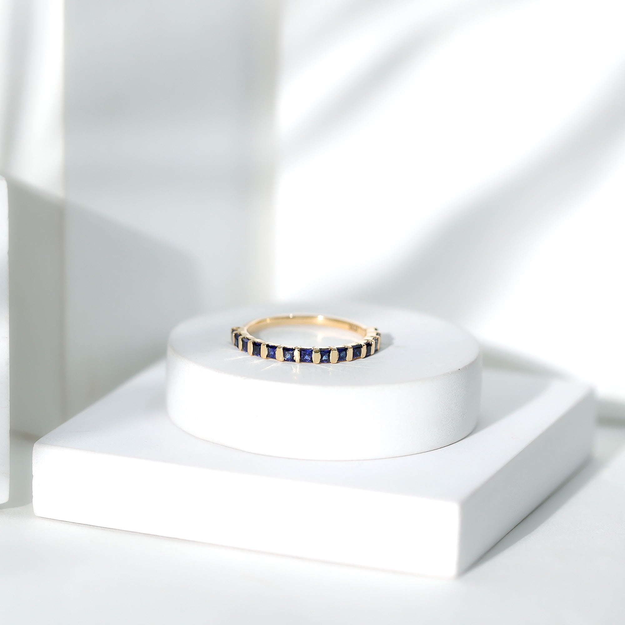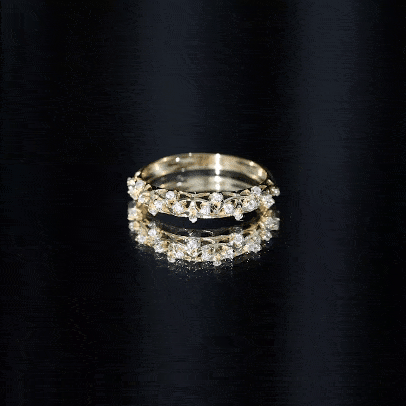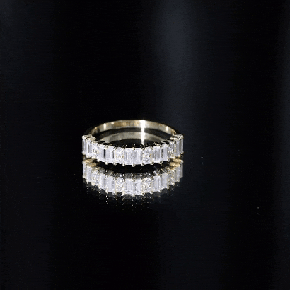 Half eternity rings feature stones on the upper half, covering 1/2 or 3/4 of the band. Considered more practical and comfortable, they allow larger stones compared to full eternity rings.