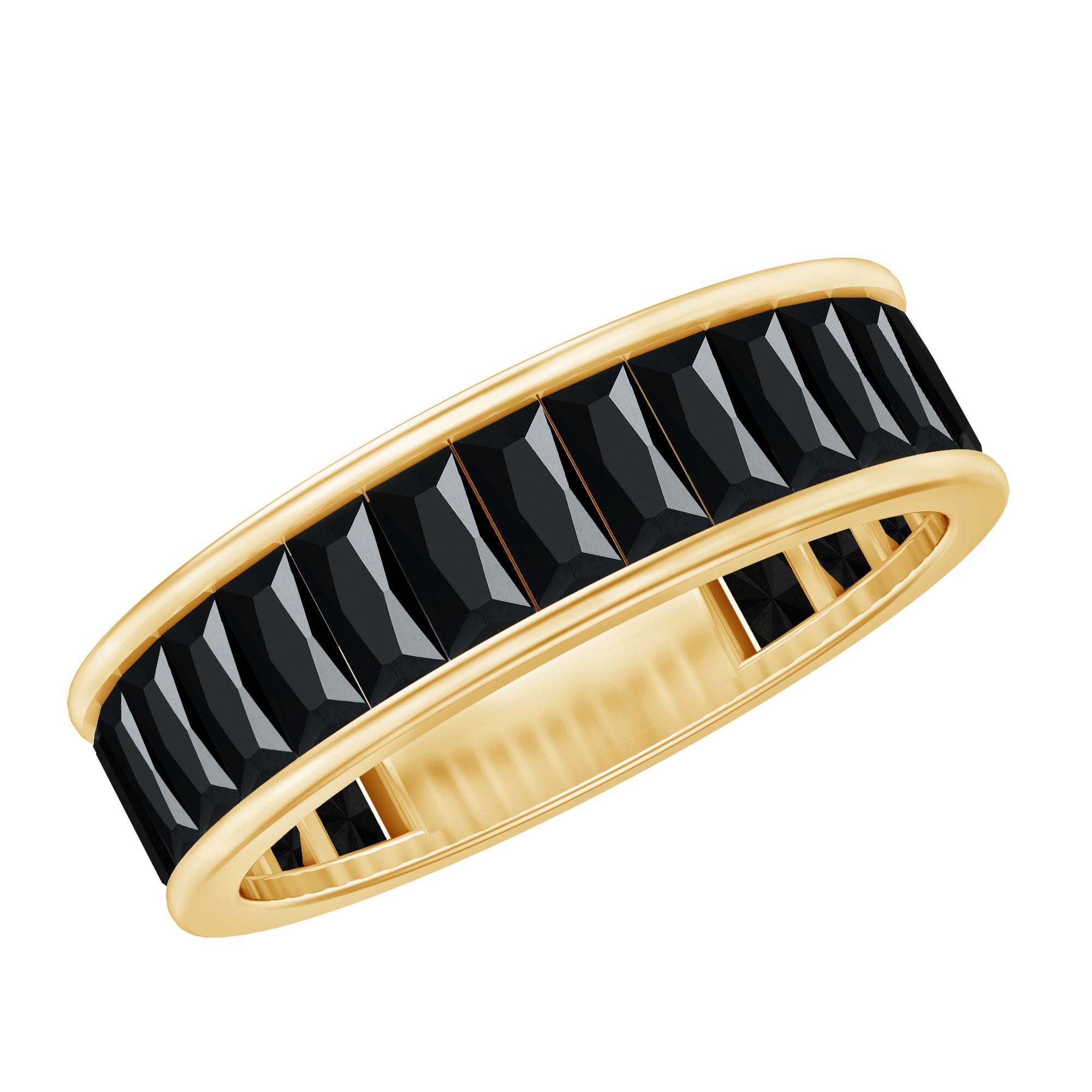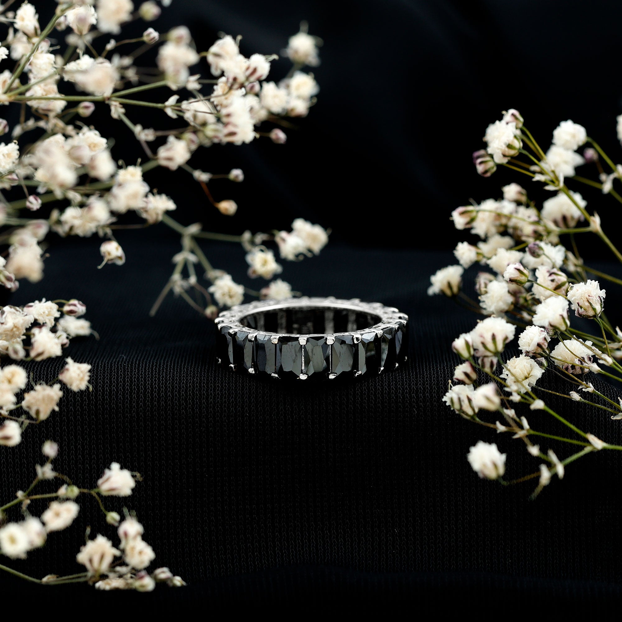 East to West eternity bands have stones arranged horizontally, often used for elongated shapes like emerald, radiant, or pear-cut stones.