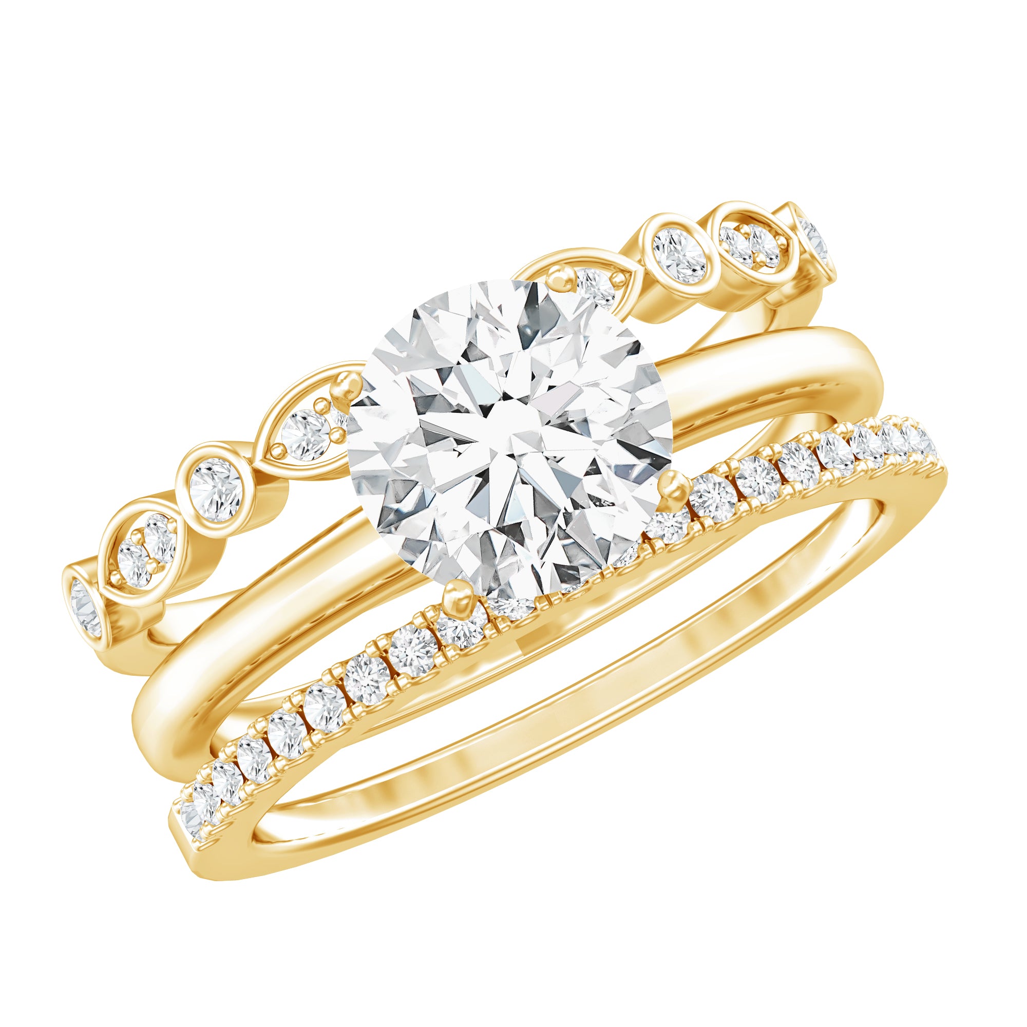 Round engagement rings with colored or shining gemstone can be easily paired with eternity bands, infinity bands and enhancer bands.