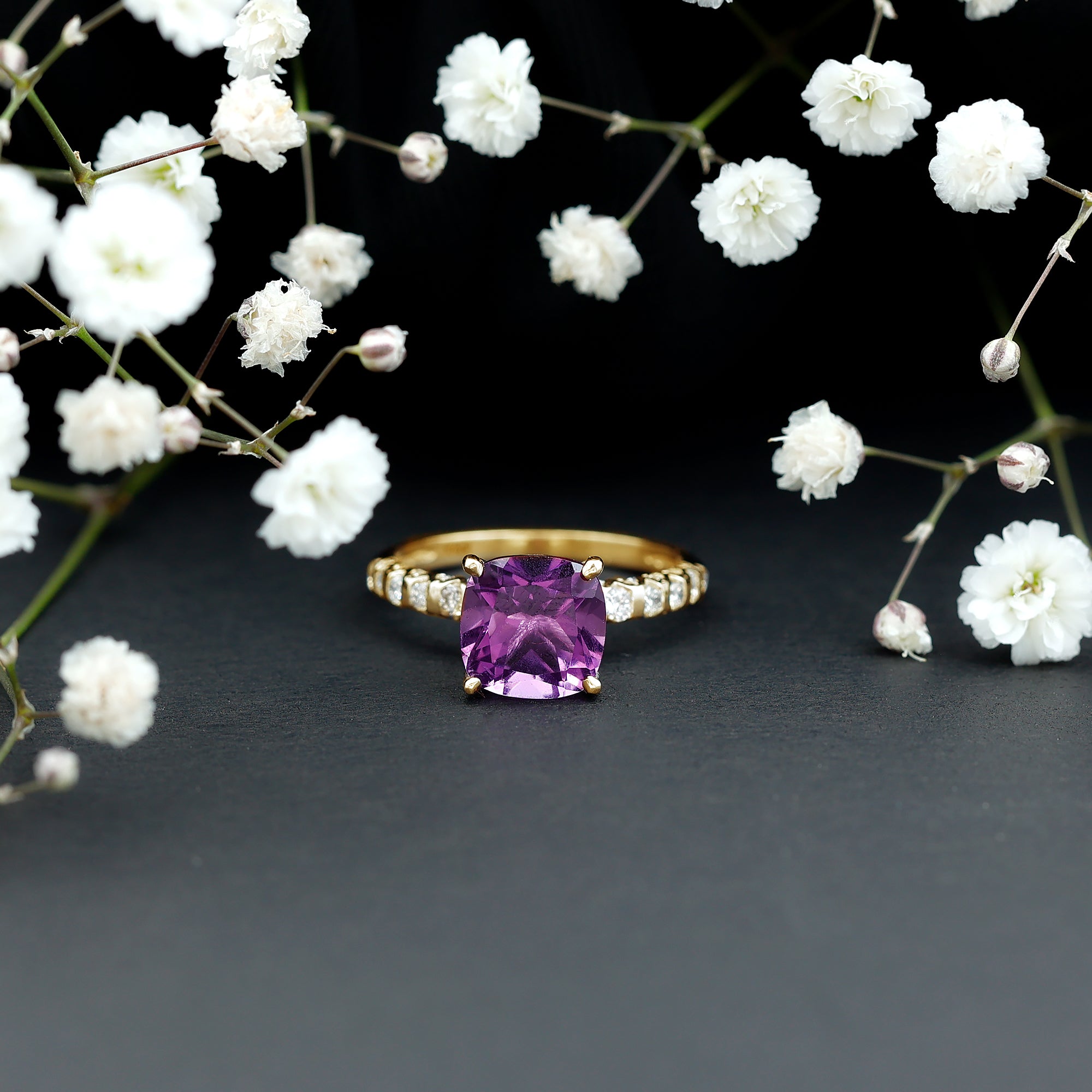 The beautiful purple gemstone ring styles range from solitaire rings to more intricate vintage-inspired rings. Natural Amethyst is popular and an extraordinary choice for wedding bands, and engagement rings. This exquisite gemstone embodies the essence of love, enduring unity, and long-term commitment.