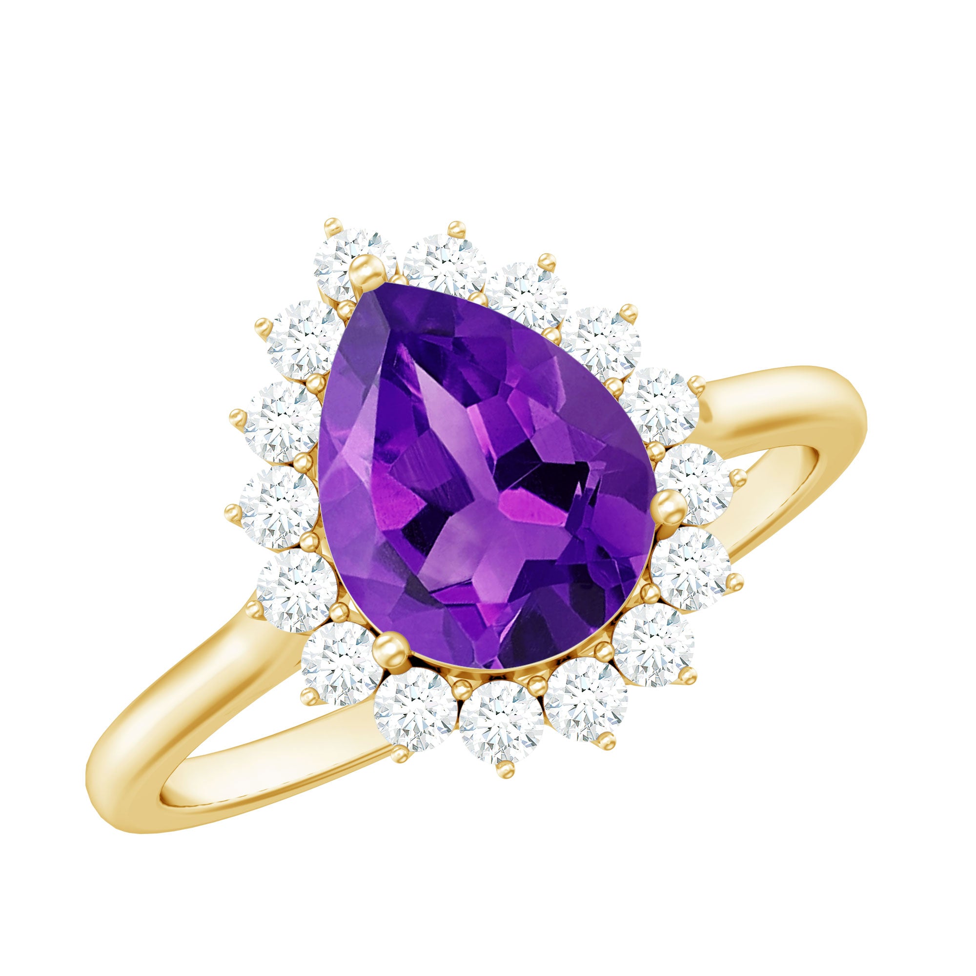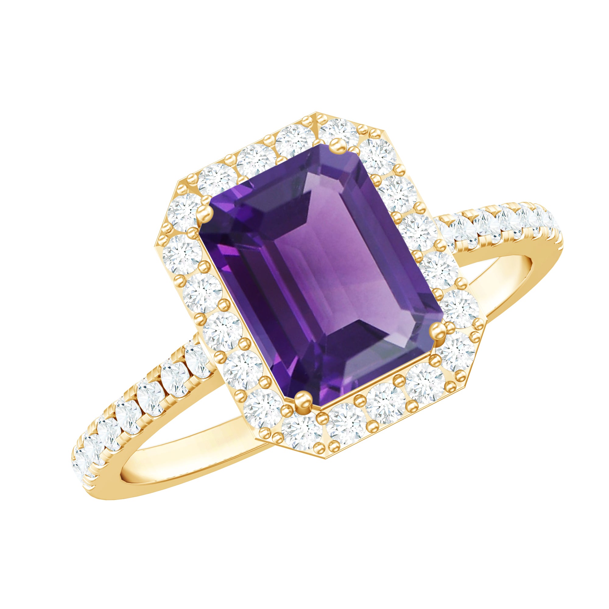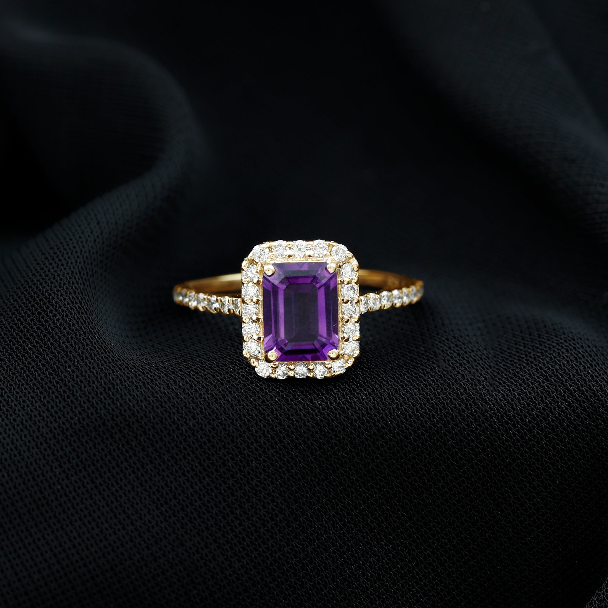 Halo gemstone settings are one of the best choices in amethyst engagement rings for women. you can wear these designs on other special occasions like parties, engagements, weddings, and parties.
