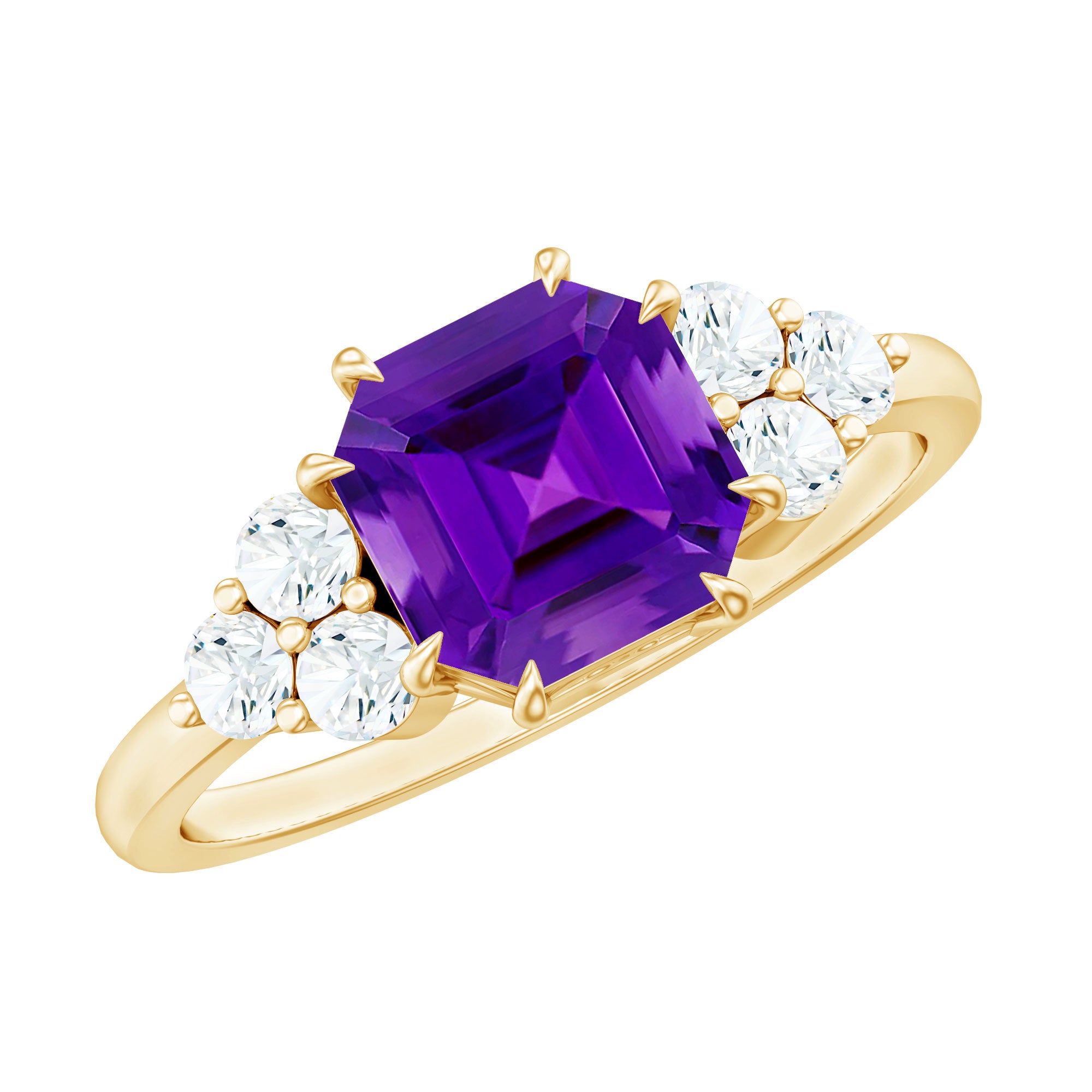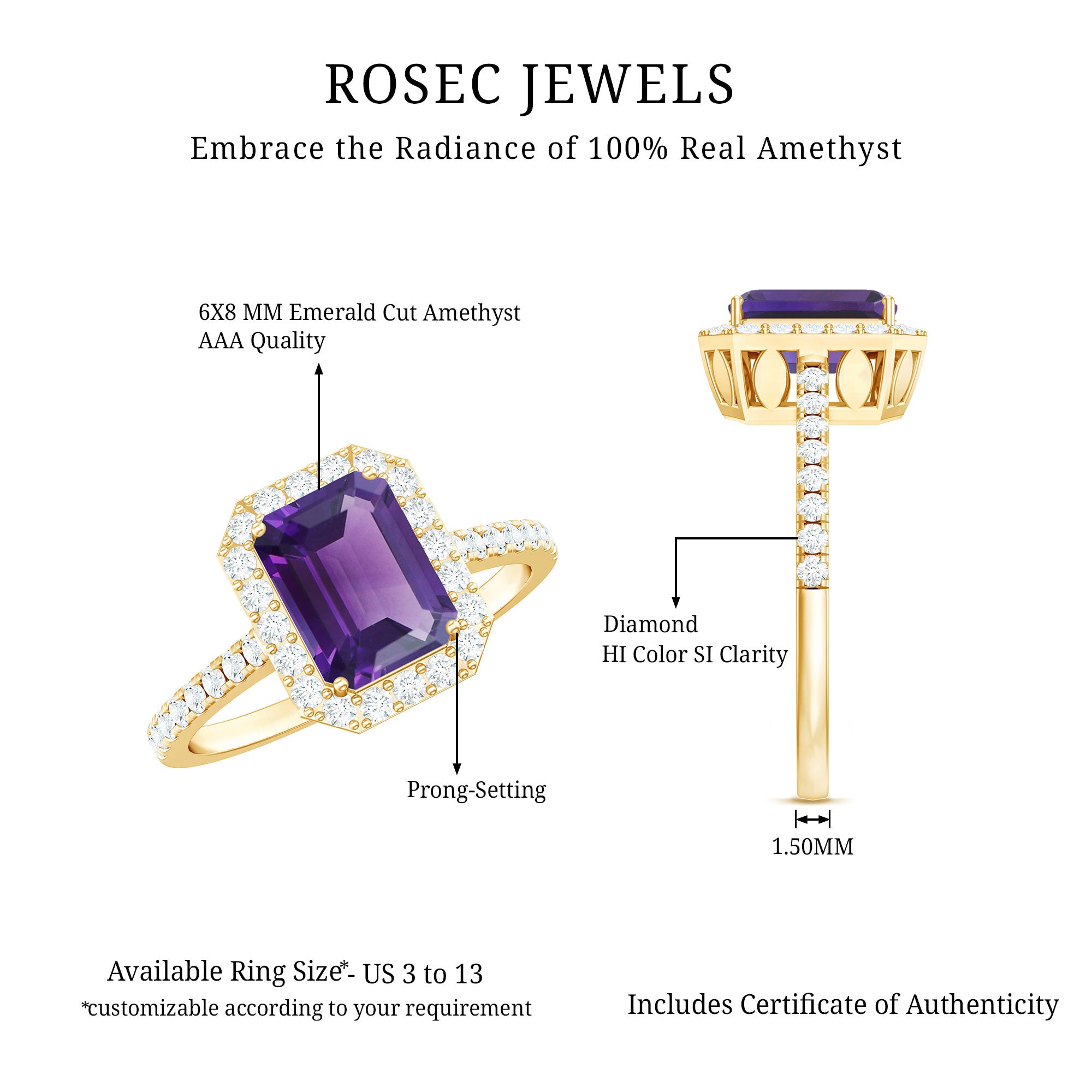Halo is a setting of gemstone rings in which small accents of gemstone surround the center stone. Our amethyst halo rings are rings with center amethyst surrounded by small accents of diamonds and moissanites. Diamond and moissanites accents help in adding more brilliance to the amethyst rings. The benefit of the Halo designs is that the style is a blend of modern and classic styles and appears bigger as compared to solitaire.